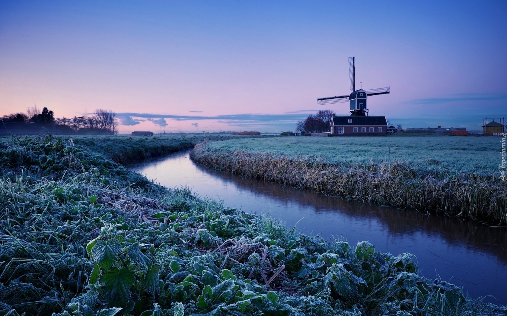 Edytor tapety: Pola, Rzeka, Wiatrak, Szron