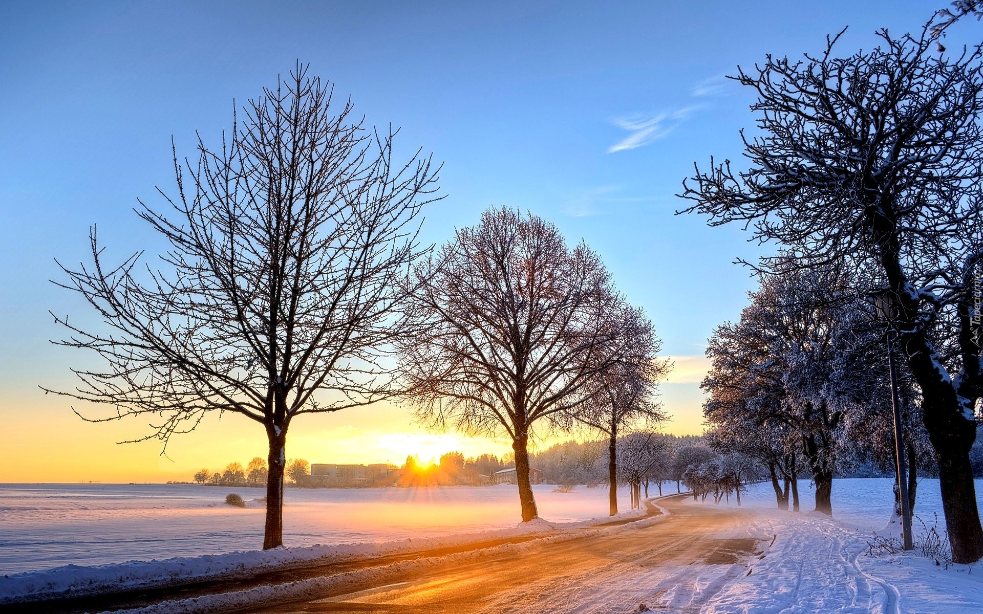 Edytor tapety: Zima, Wschód, Słońca, Pola, Droga, Drzewa