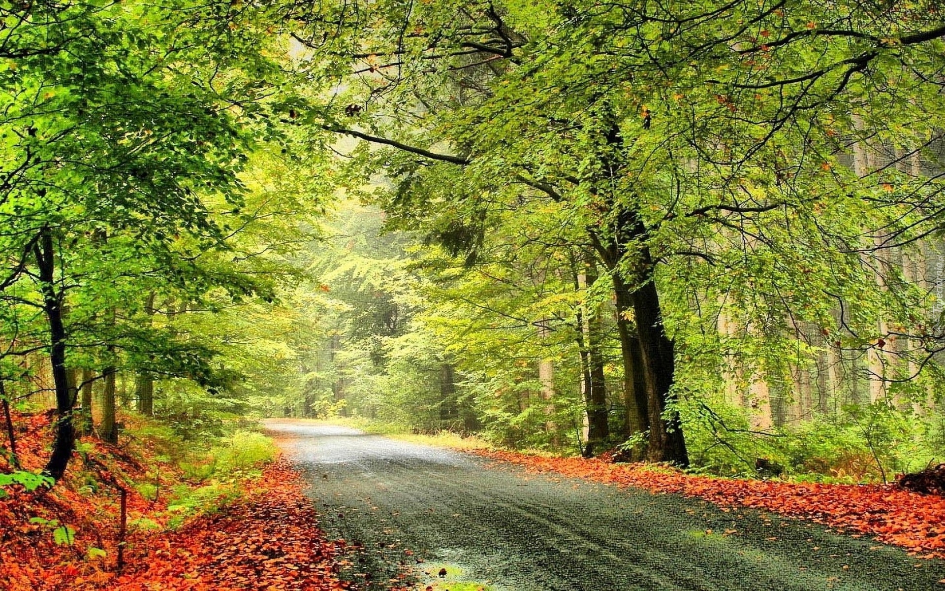Edytor tapety: Las, Droga, Liście, Jesień