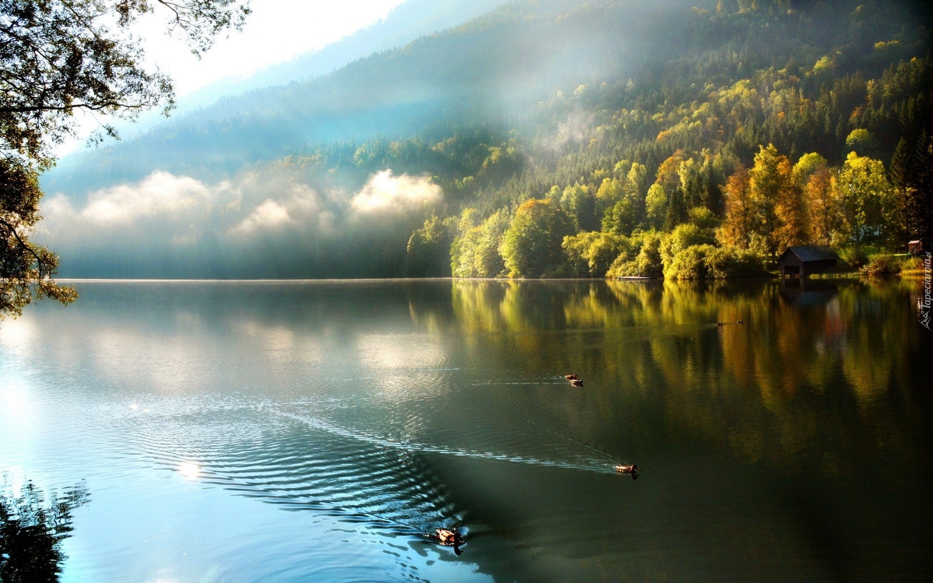 Edytor tapety: Jezioro, Mgła, Kaczki, Drzewa