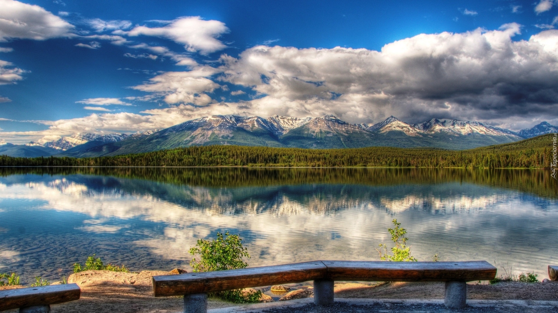 Edytor tapety: Jezioro, Las, Góry, Ławki
