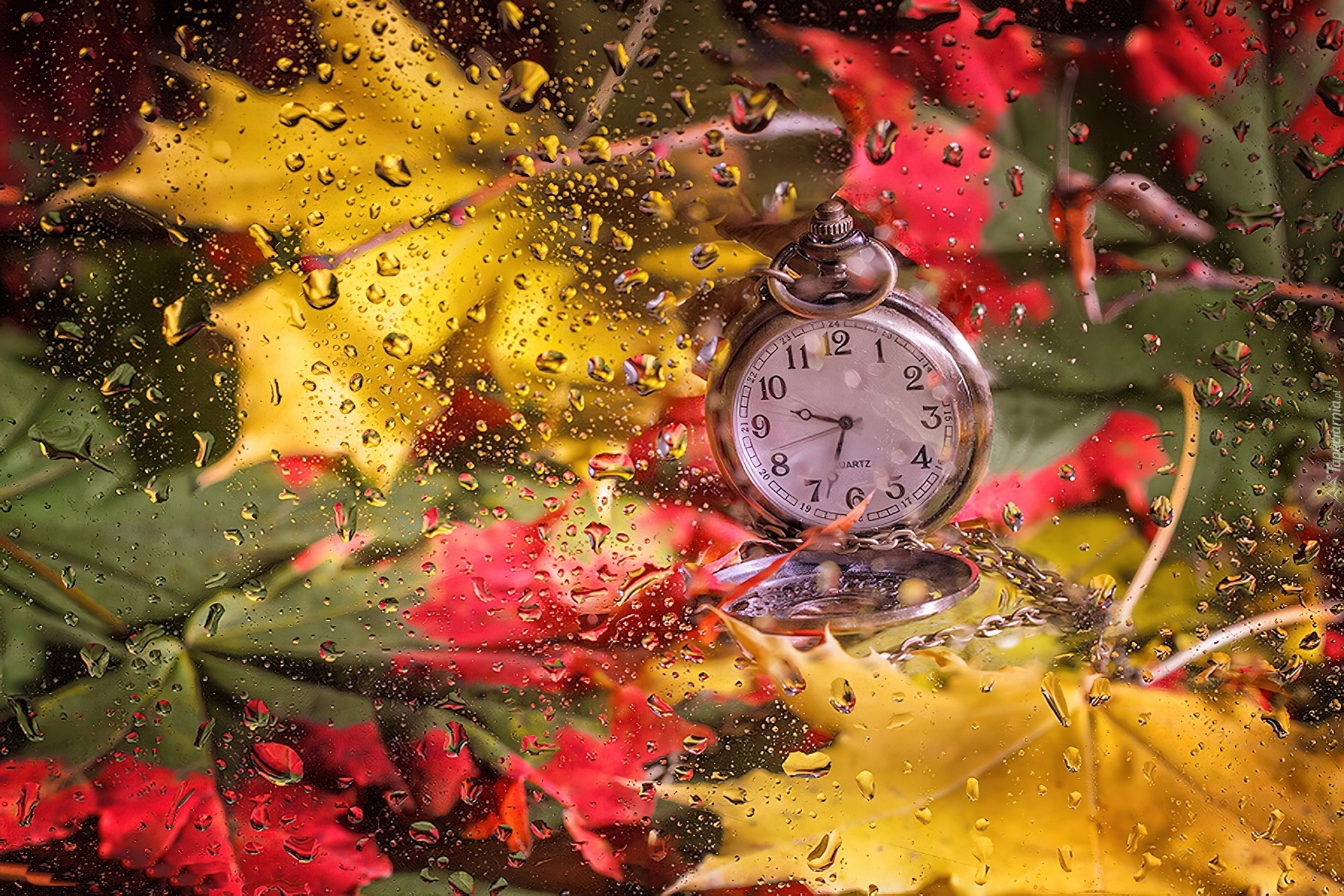 Edytor tapety: Zegarek, Jesień, Liście, Krople, Deszczu