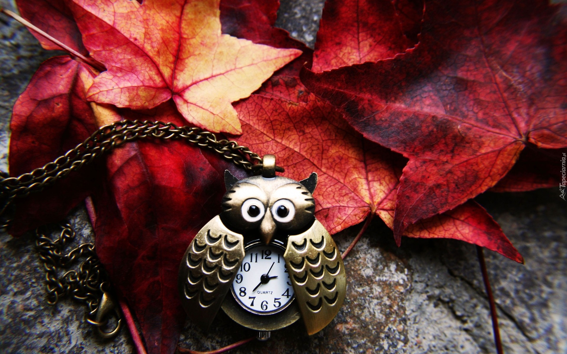 Edytor tapety: Jesień, Liście, Zegarek, Sowa