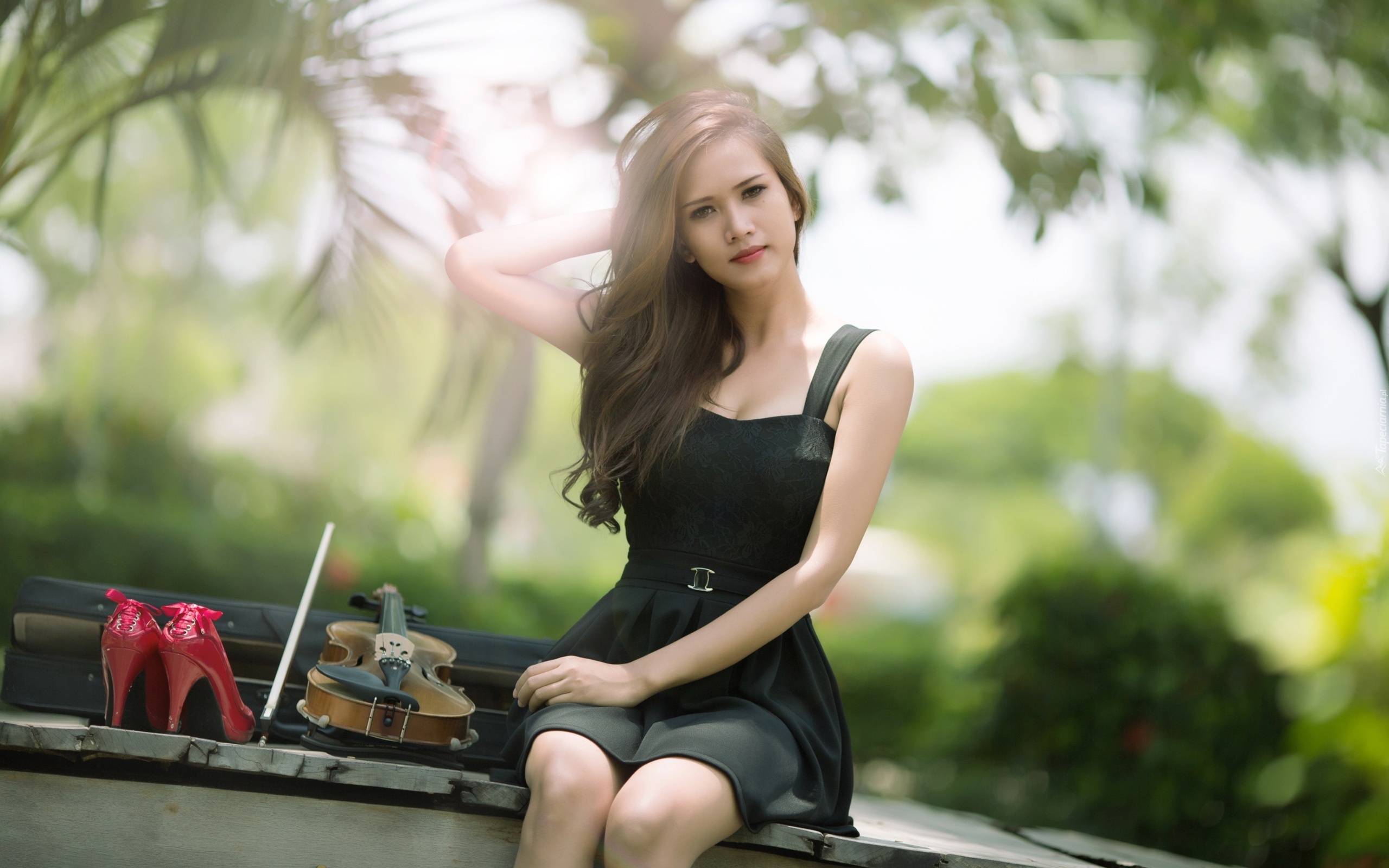 Edytor tapety: Kobieta, Siedzi, Skrzypce, Pantofle