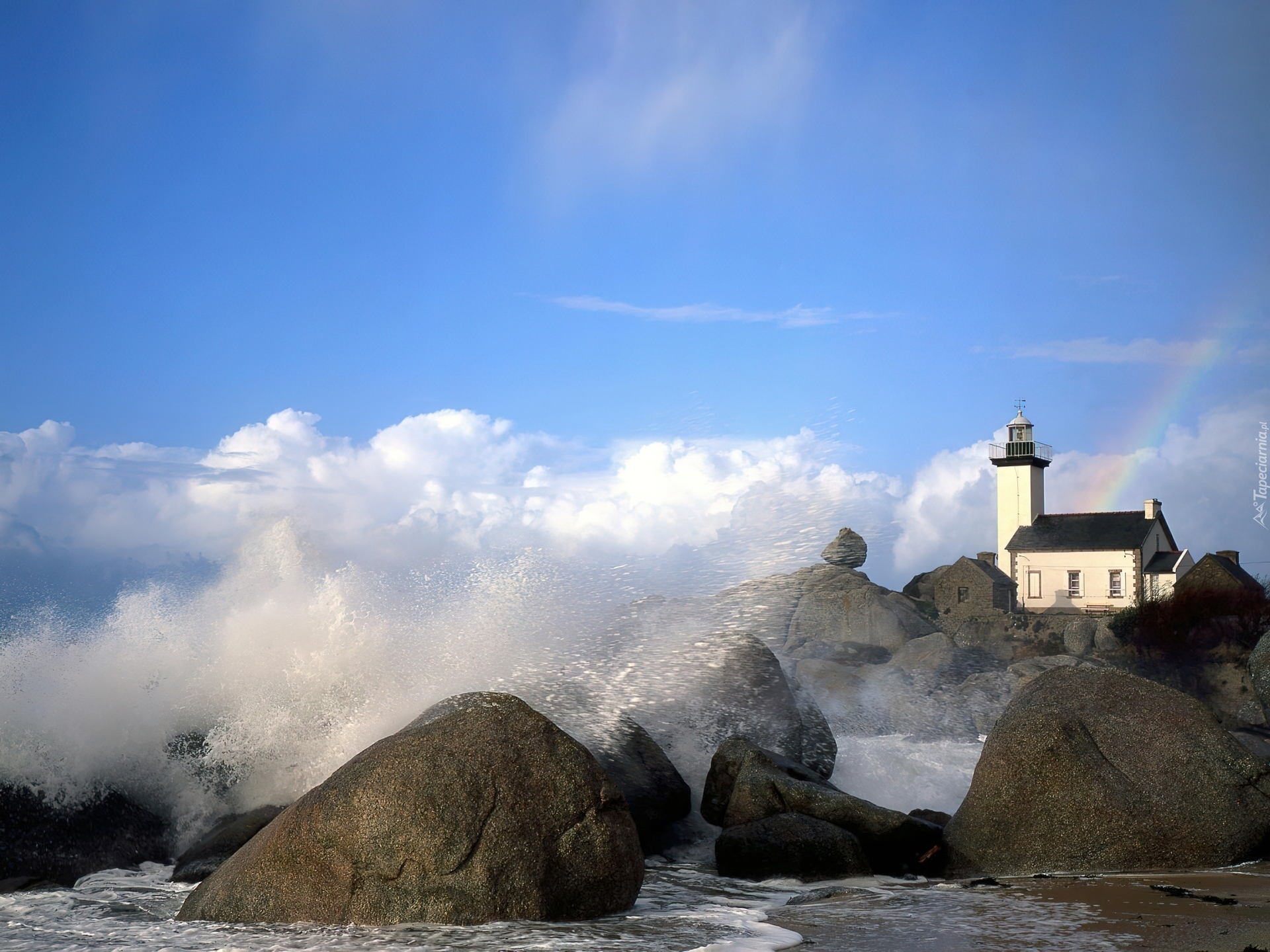 Edytor tapety: Fale, Kamienie, Latarnia morska, Tęcza