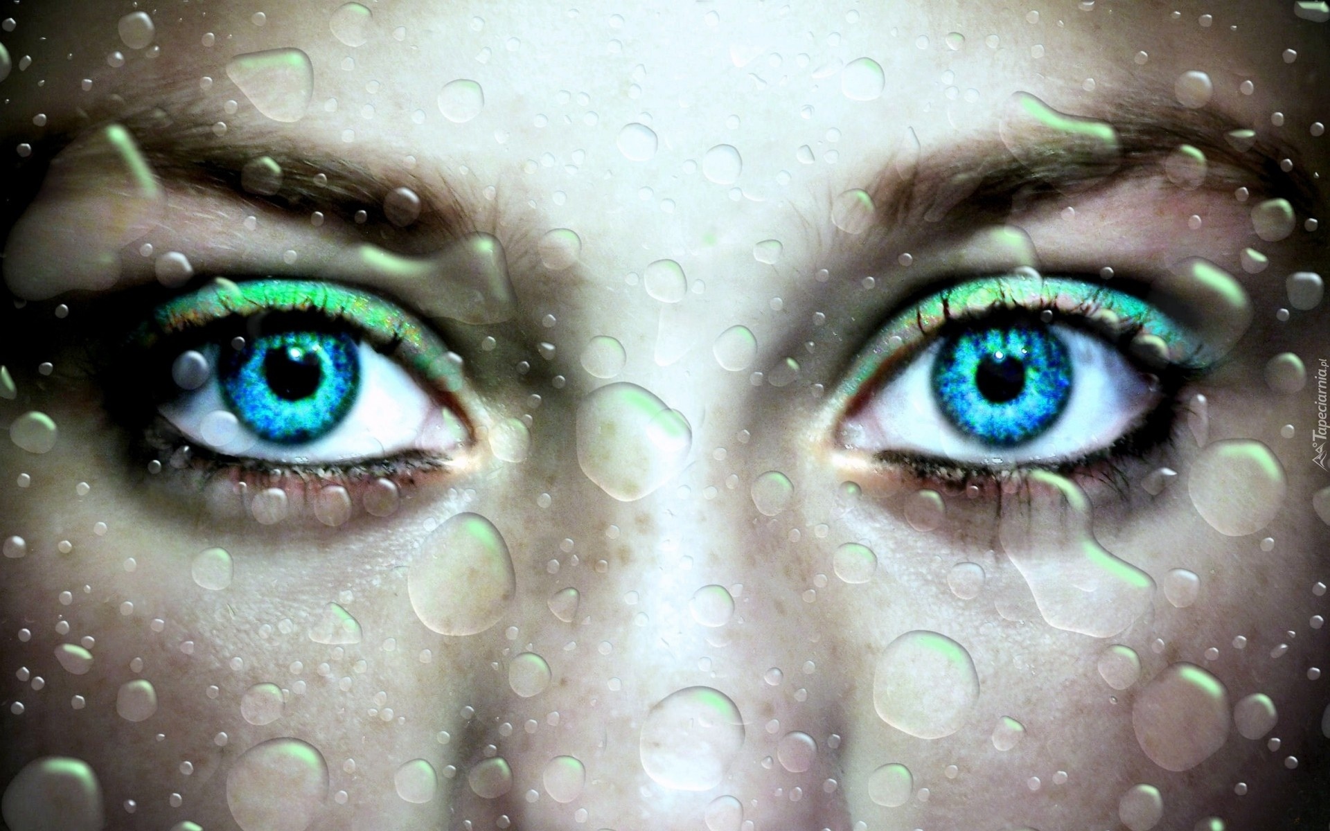 Edytor tapety: Spojrzenie, Niebieskie, Oczy, Krople