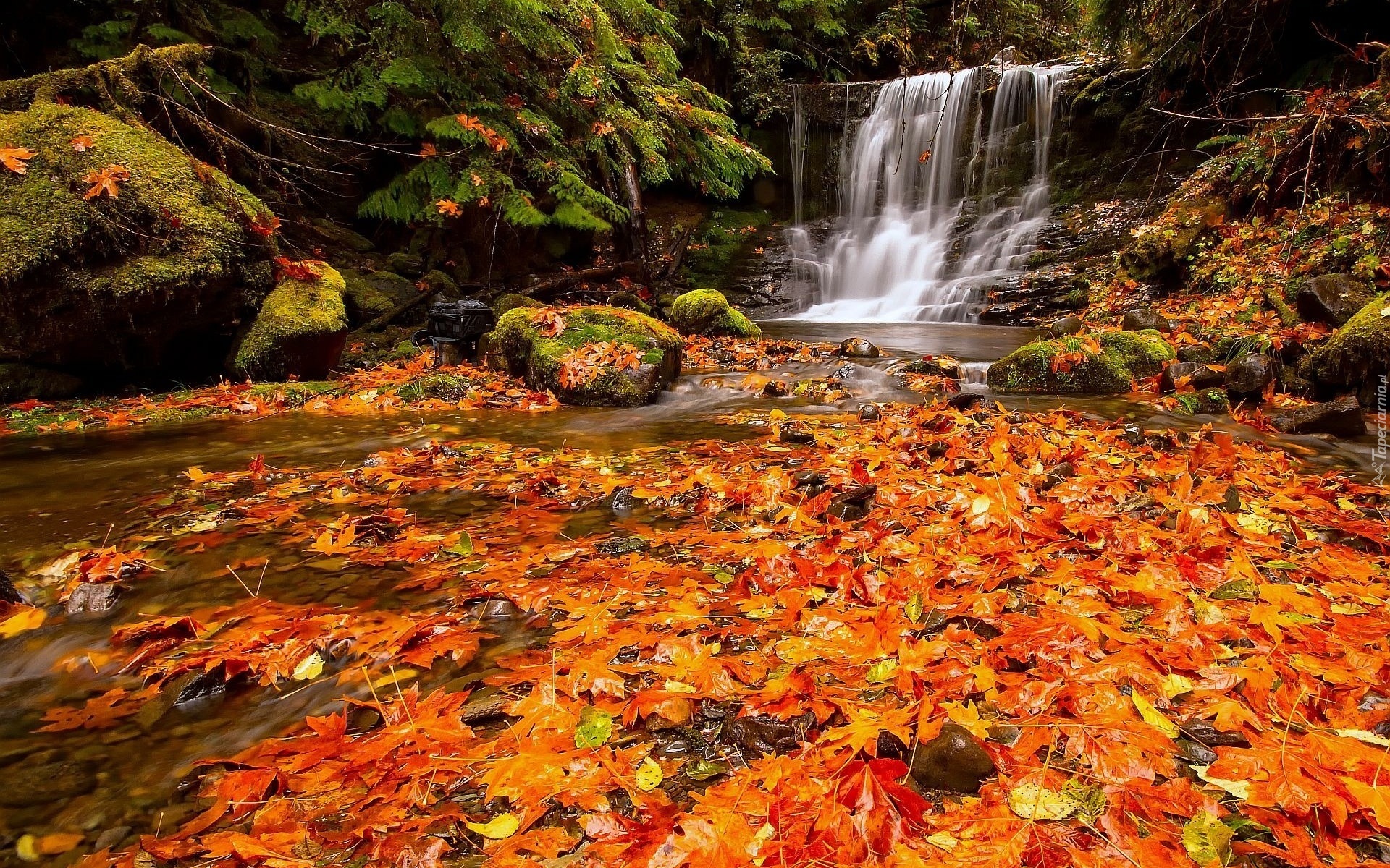 Edytor tapety: Wodospad, Las, Liście, Jesień
