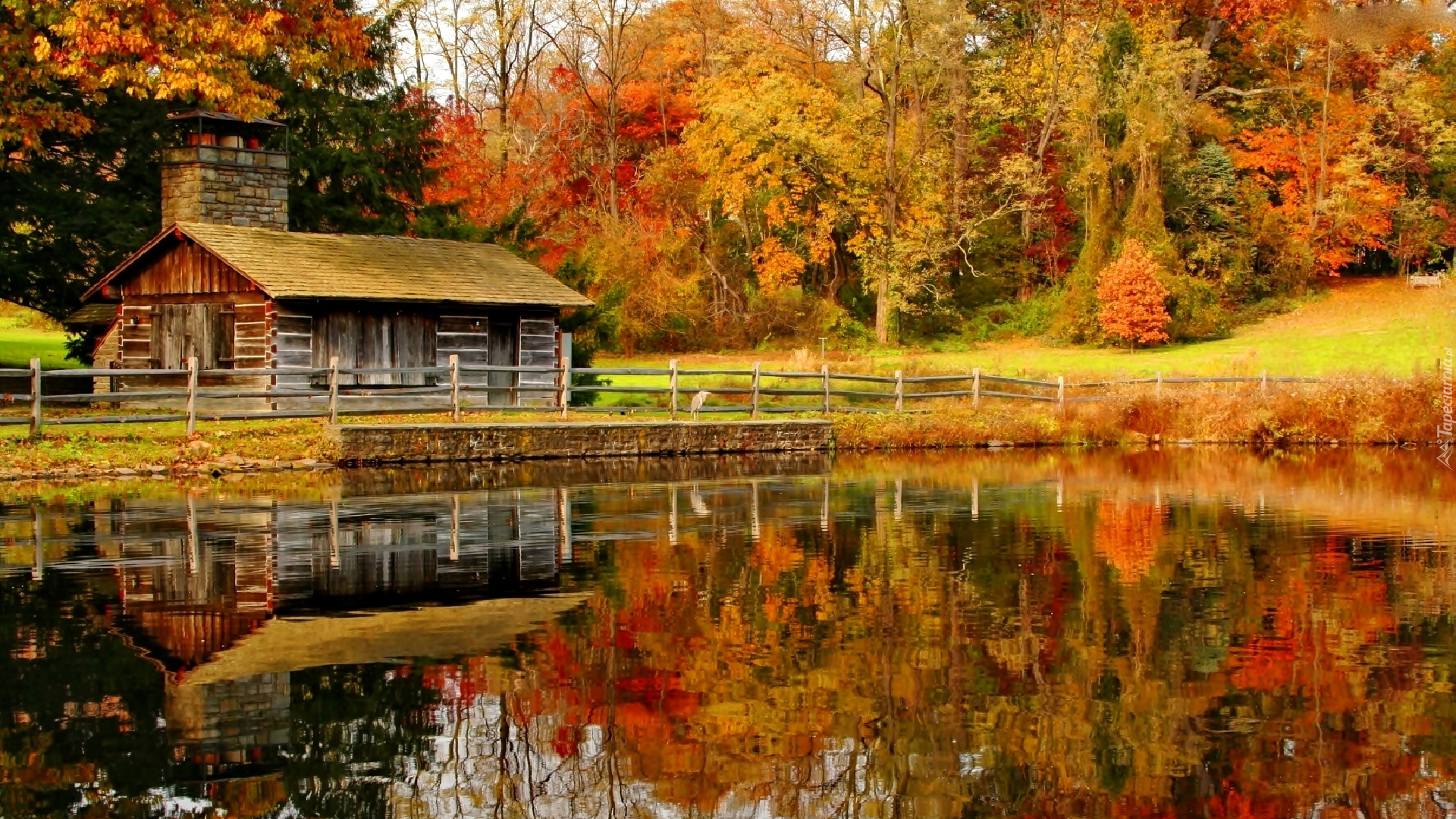 Edytor tapety: Las, Kolorowe, Liście, Staw, Budynek, Odbicie