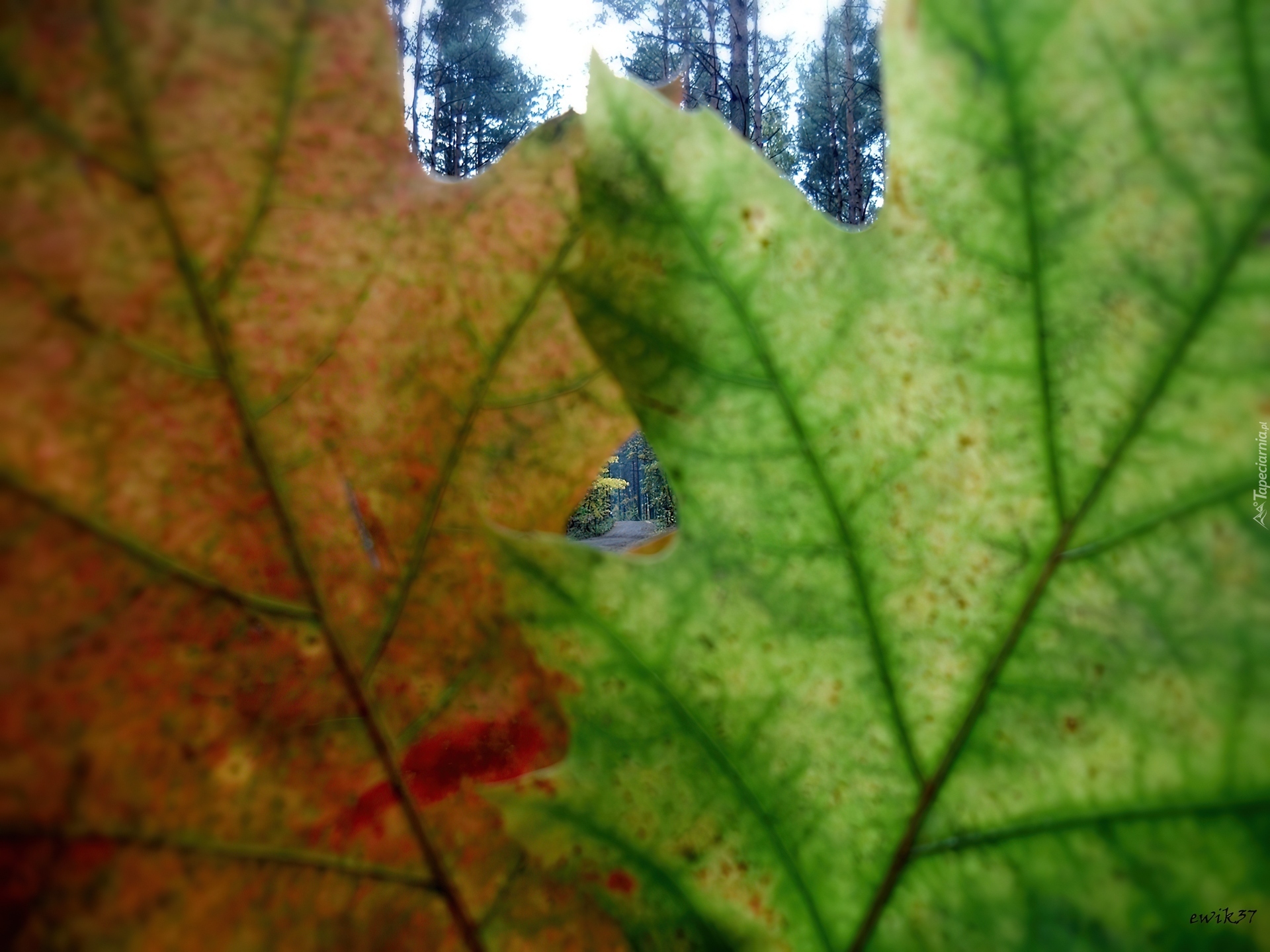 Edytor tapety: Dwa, Dębowe, Liście, Okienko, Droga, Las