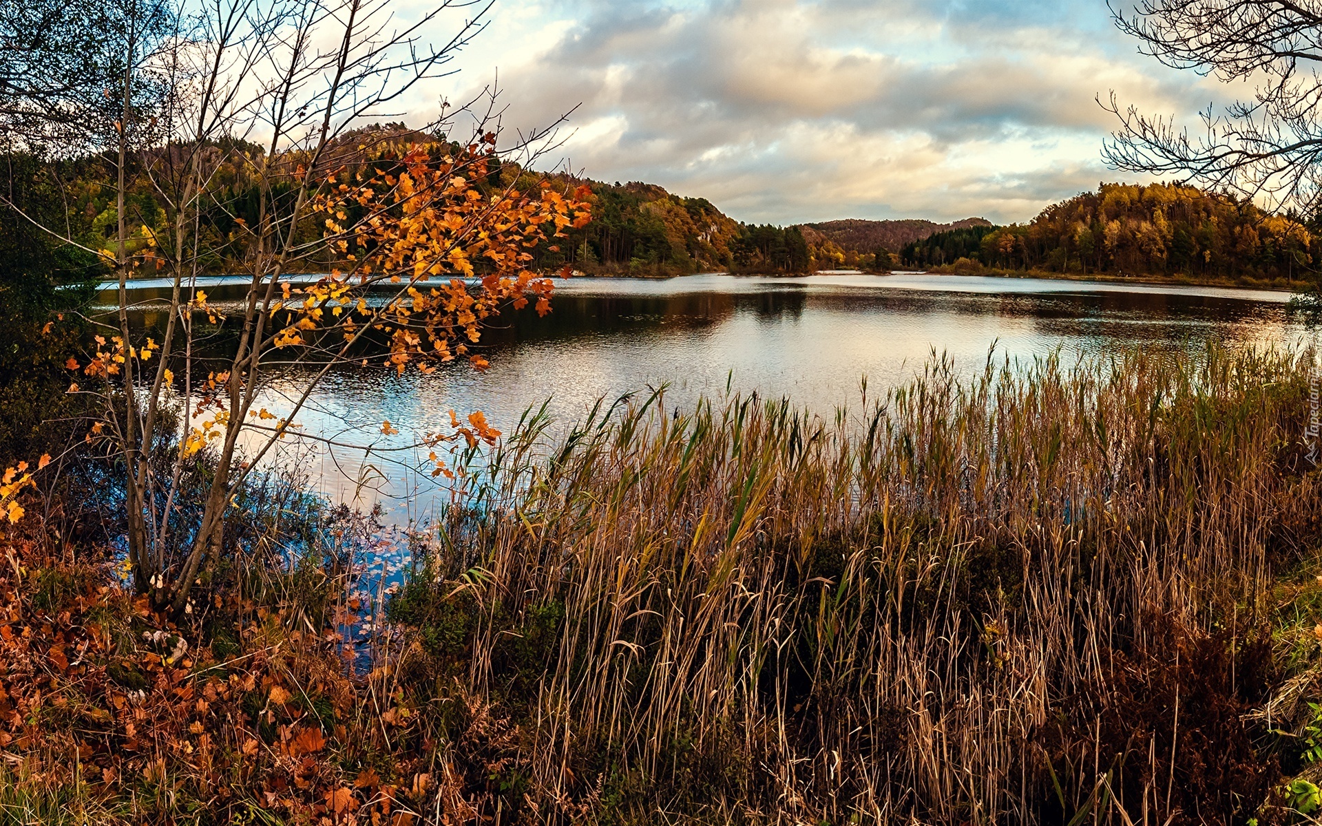 Edytor tapety: Jezioro, Góry, Lasy, Trawy, Jesień