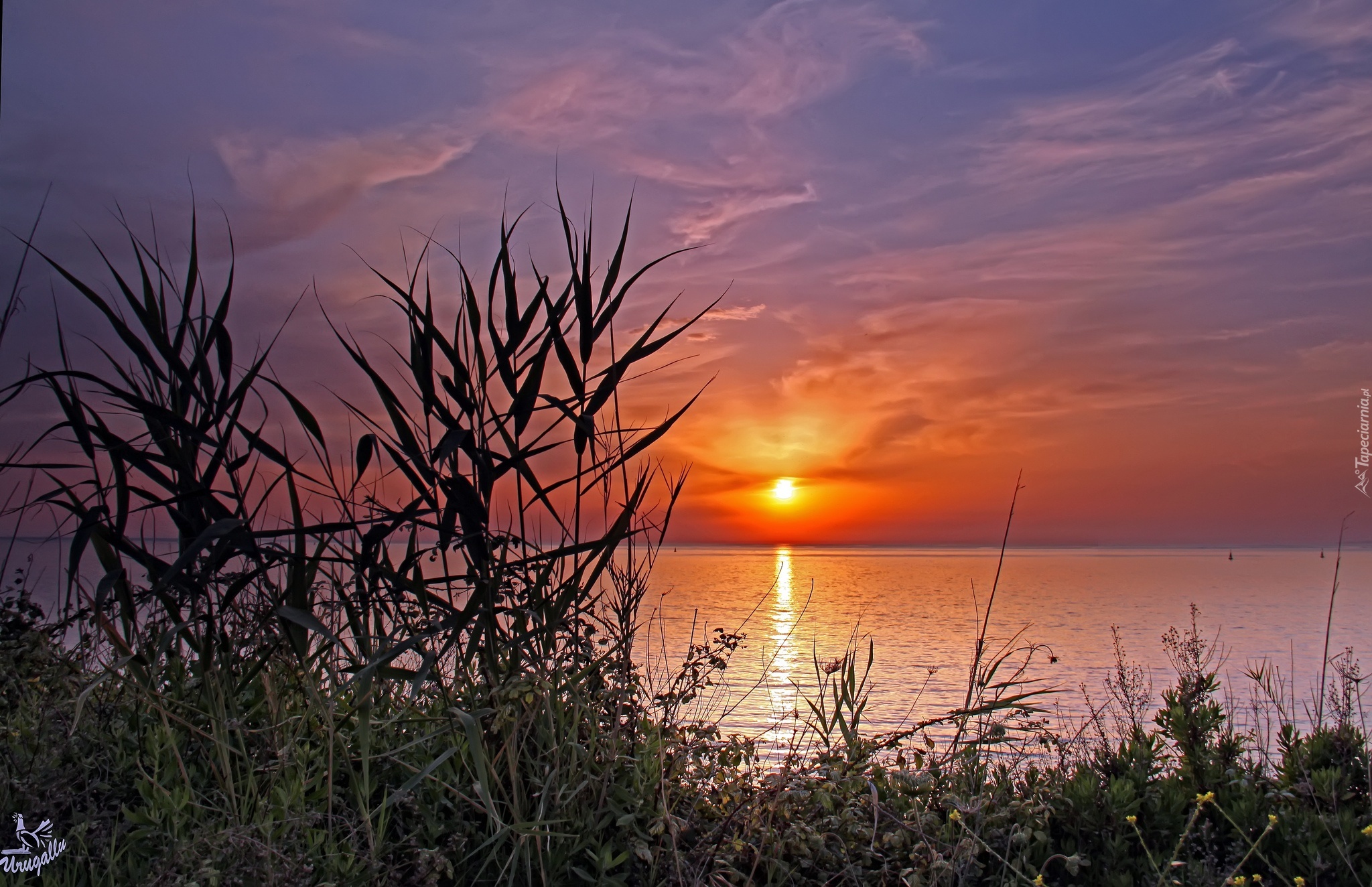 Edytor tapety: Jezioro, Żaglówki, Trawy, Zachód, Słońca