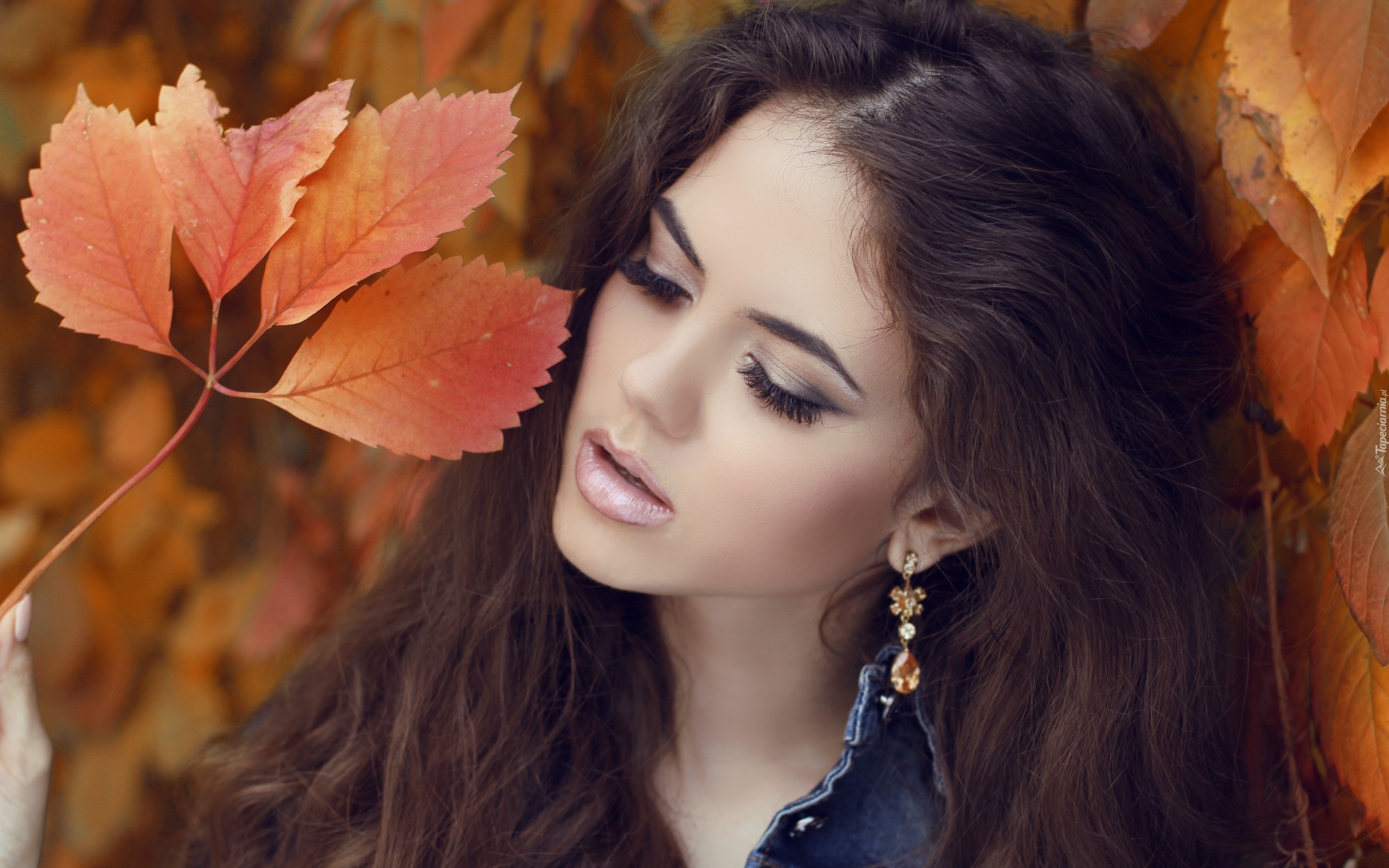 Edytor tapety: Modelka, Biżuteria, Makijaż, Liść, Jesień