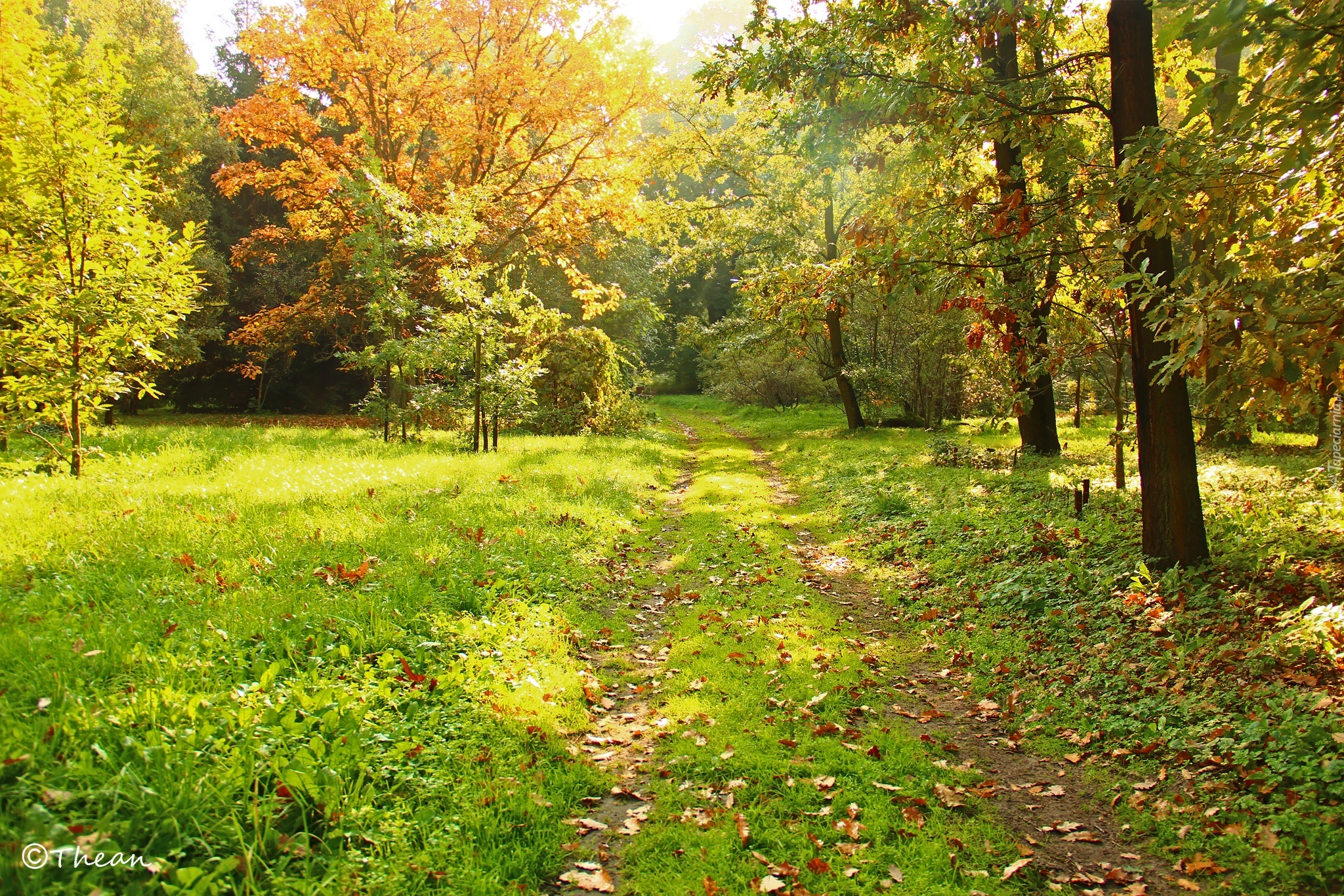 Edytor tapety: Park, Dróżka, Drzewa, Trawa, Jesień, Kolorowe, Liście
