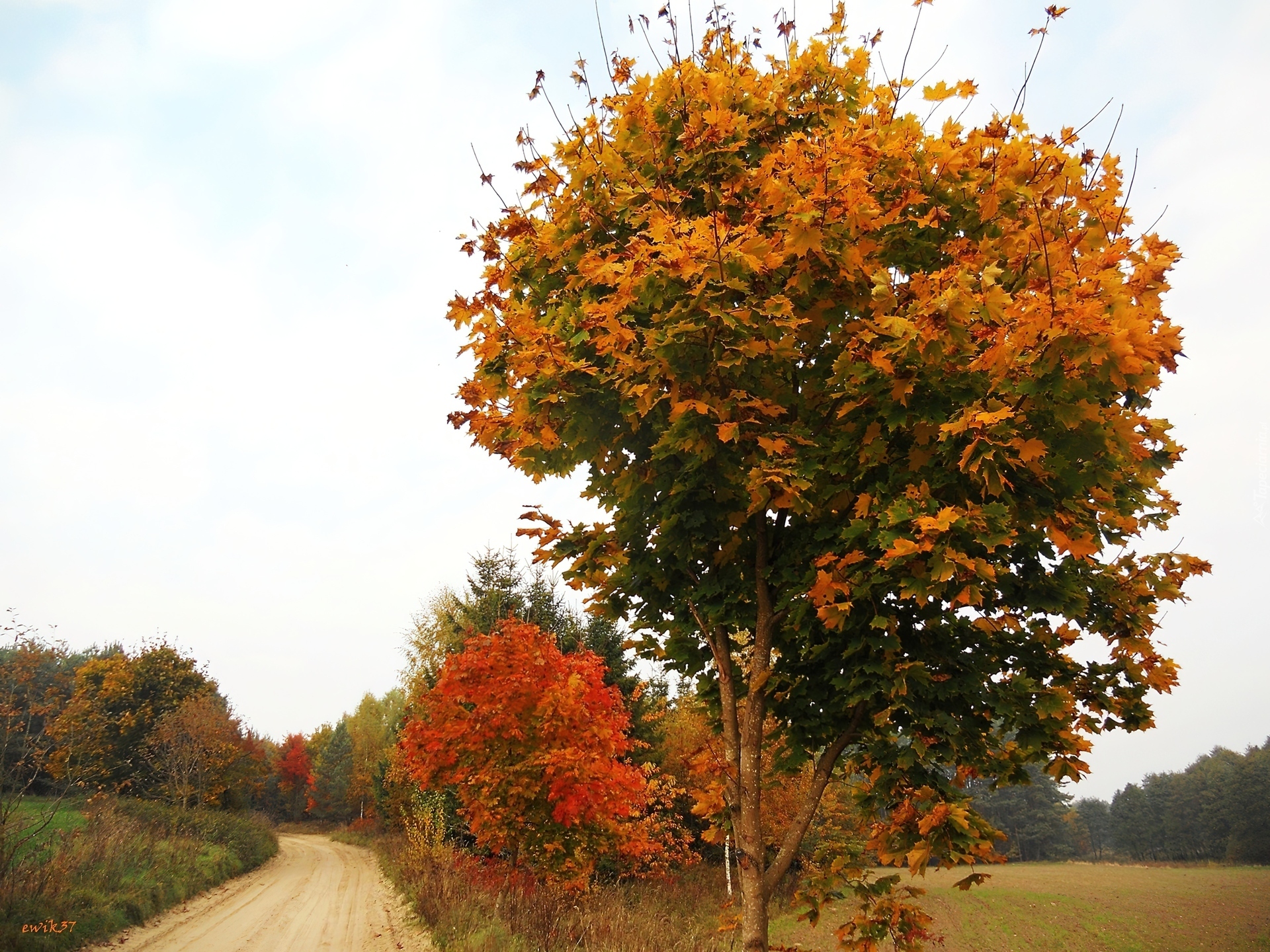 Edytor tapety: Klonowe, Drzewo, Droga, Pole, Las