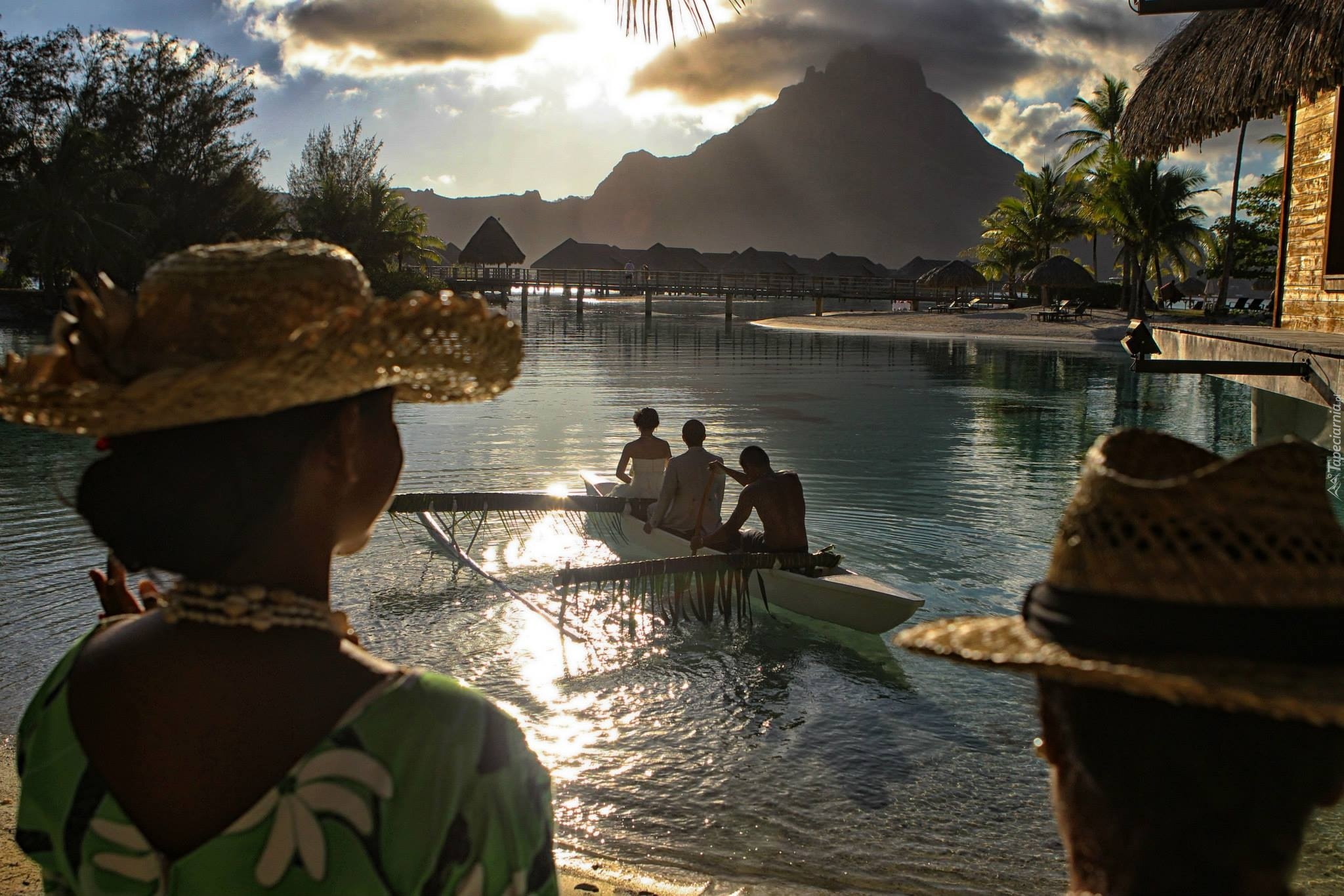 Edytor tapety: Jezioro, Góry, Wioślarze, Kobieta, Kapelusz
