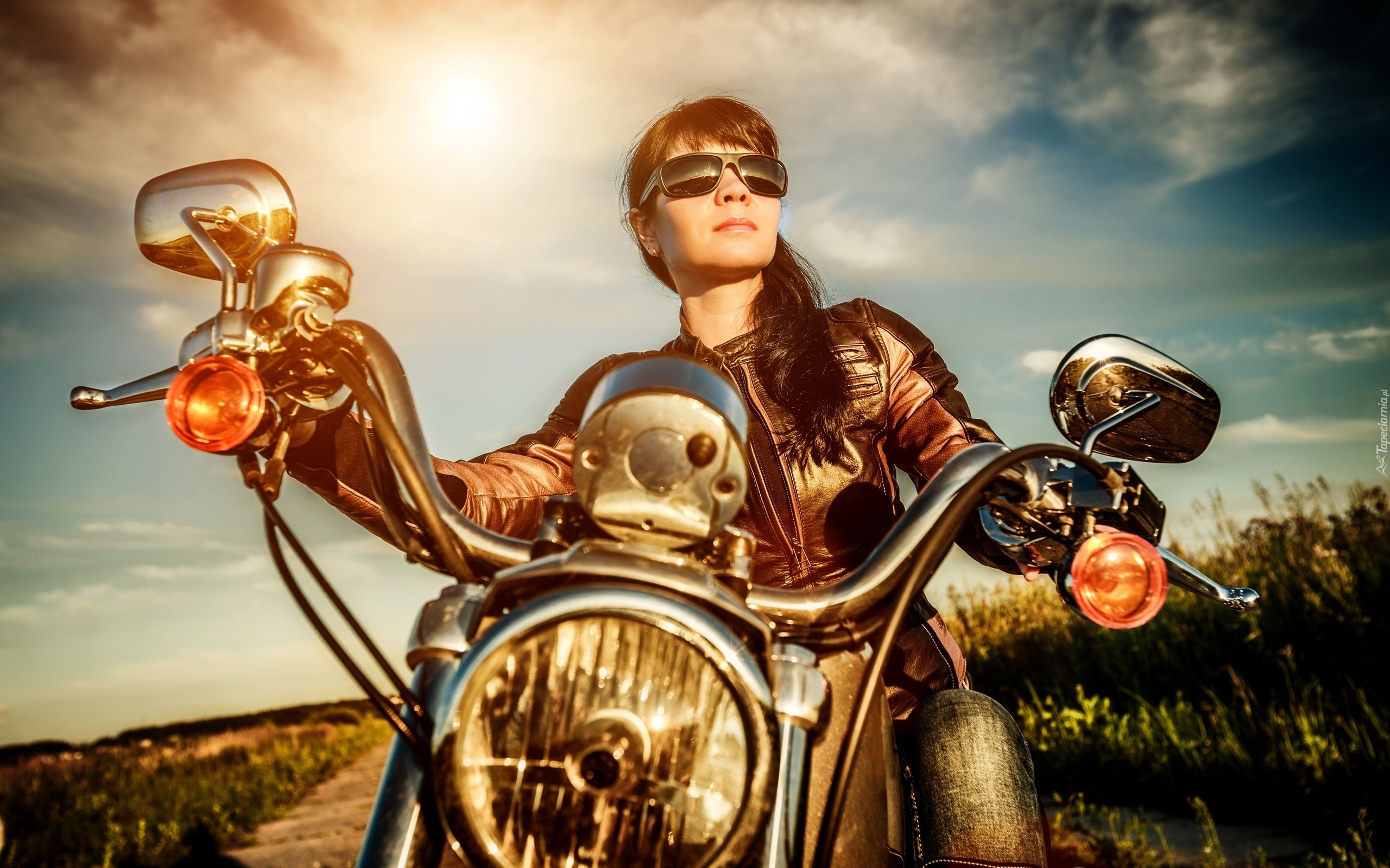 Edytor tapety: Dziewczyna, Motocykl, Retro, Droga, Pola