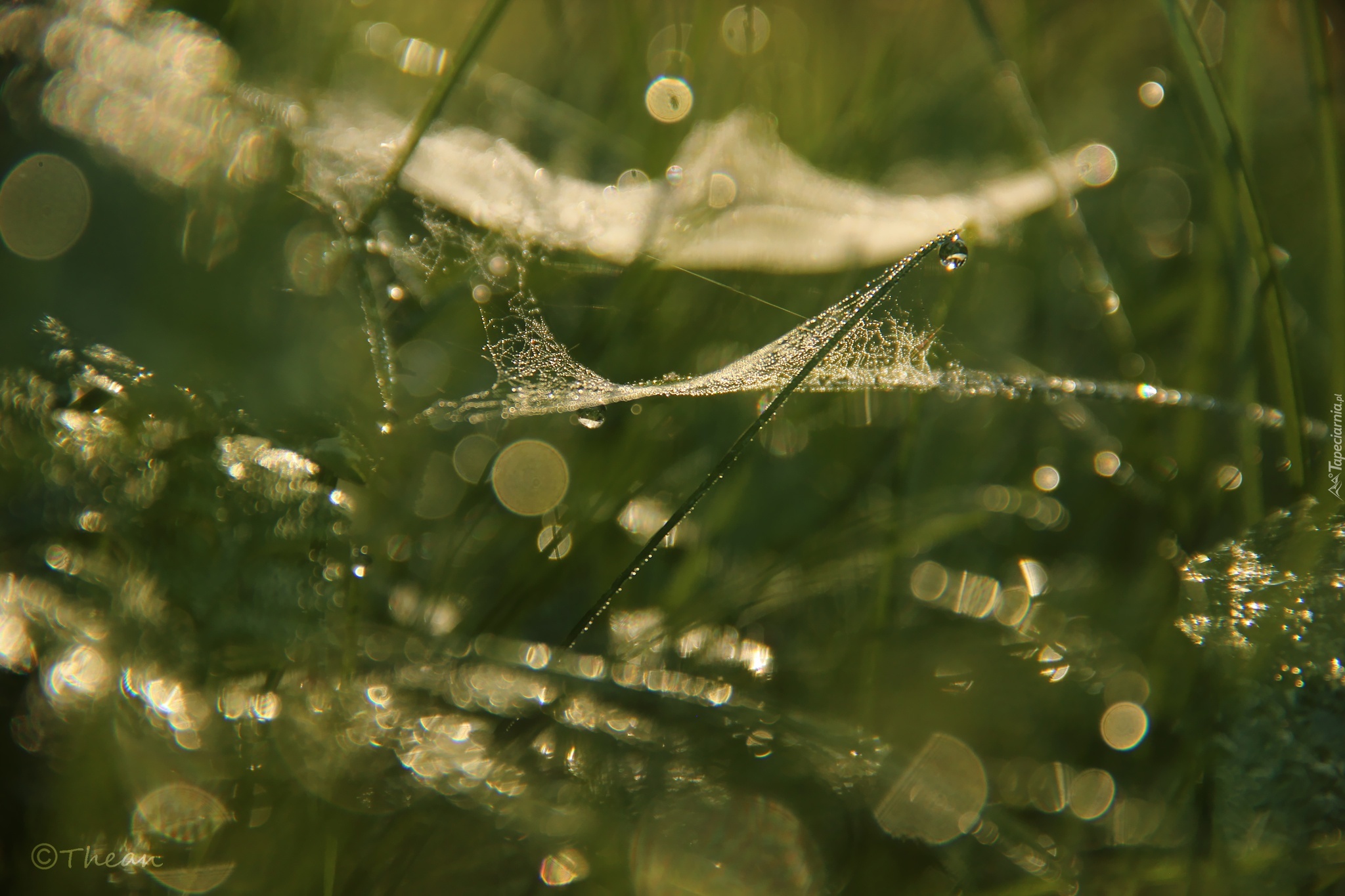 Edytor tapety: Trawa, Bokeh, Pajęczyna, Krople