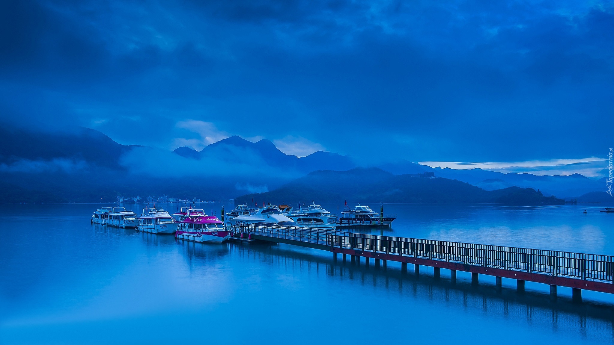 Edytor tapety: Góry, Mgła, Pomost, Przystań, Łodzie
