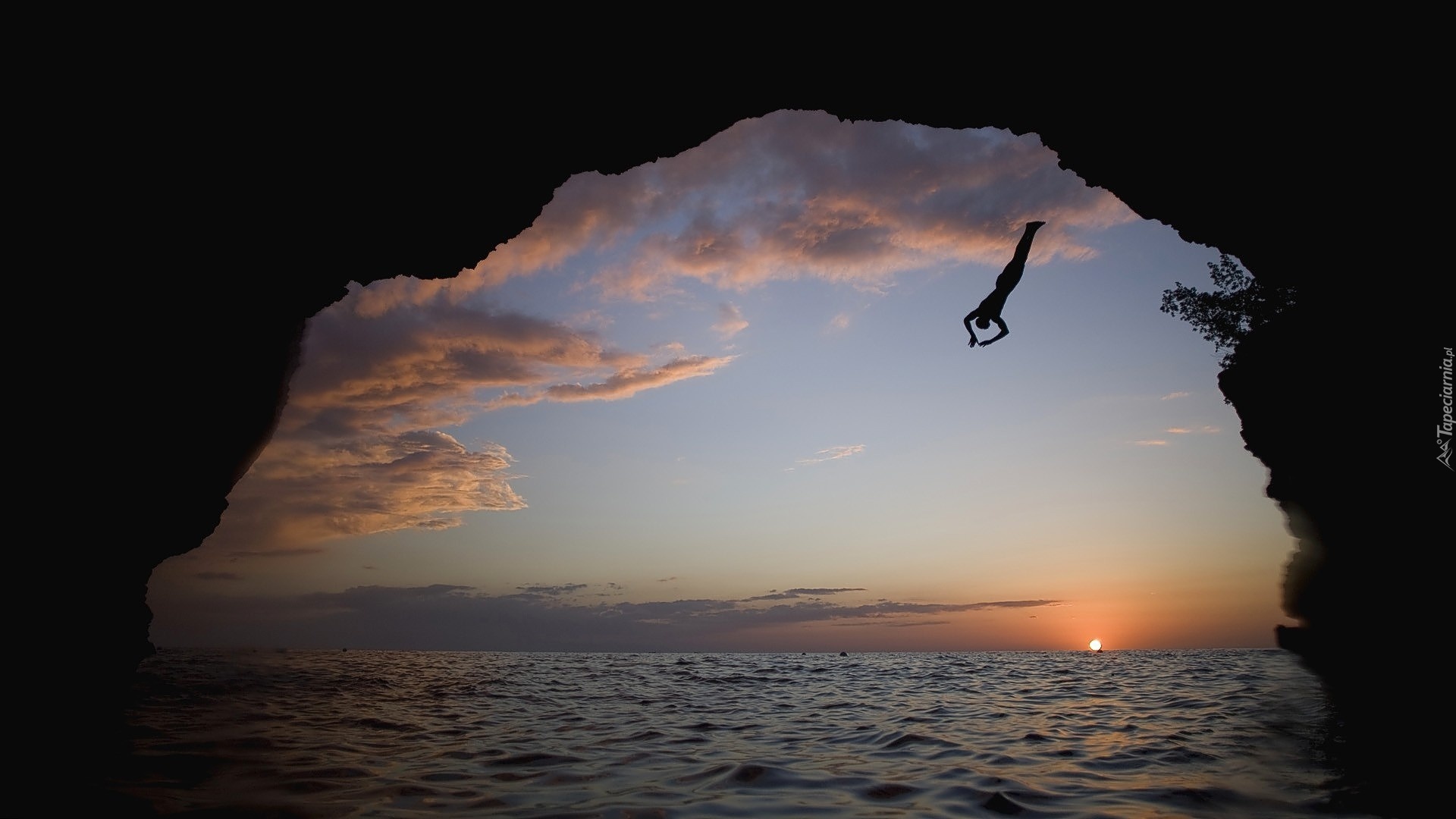 Edytor tapety: Morze, Skała, Zachód, Słońca, Skok, Do, Wody