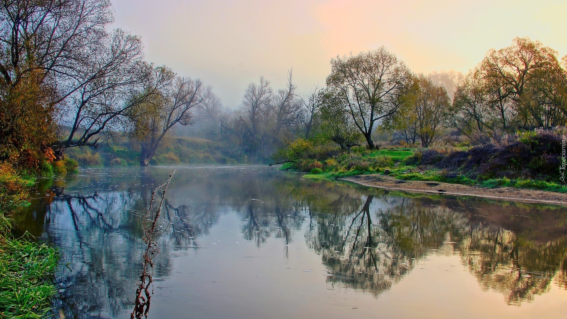 Edytor tapety: Rzeka, Mgła, Drzewa
