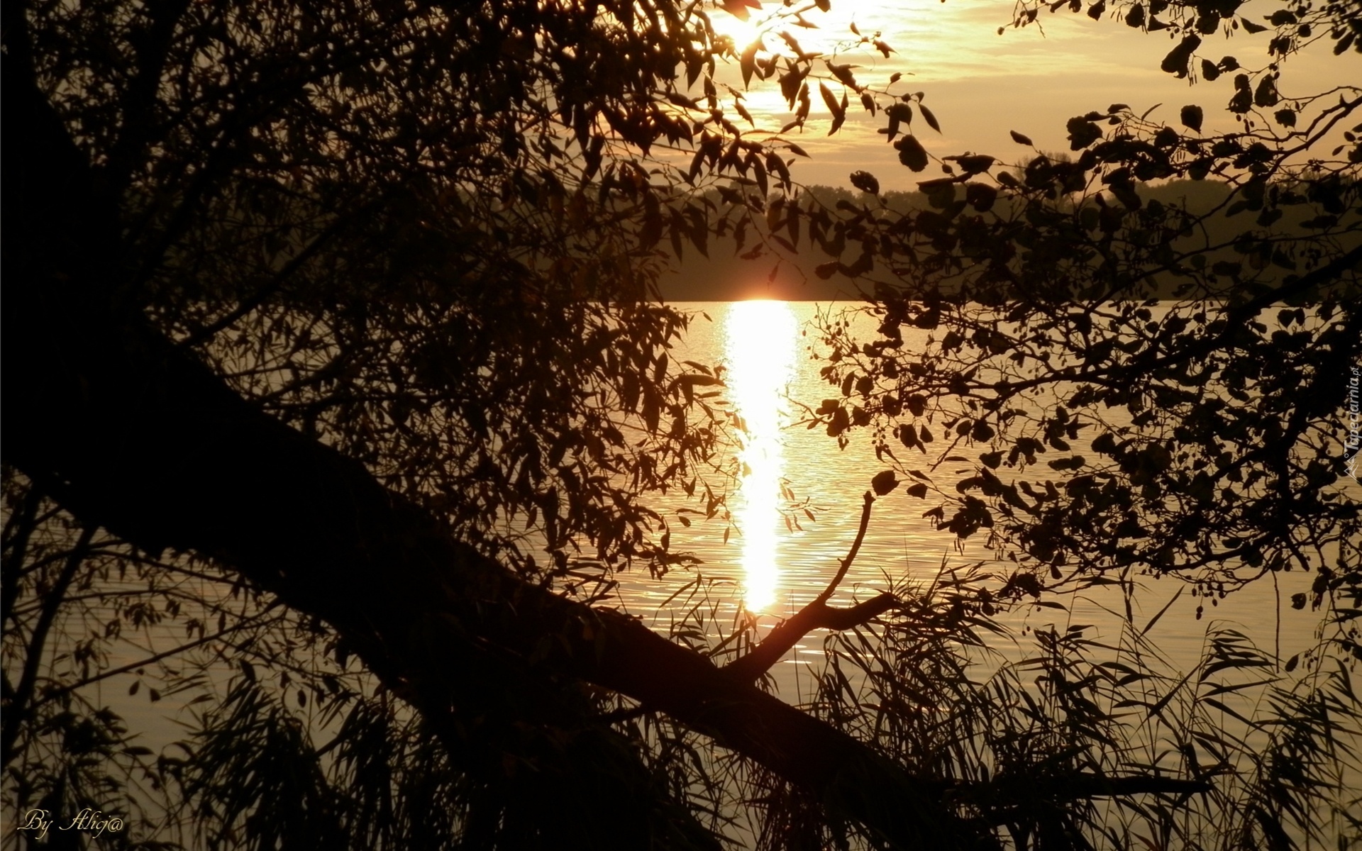 Edytor tapety: Jezioro, Zachód, Słońca, Gałęzie