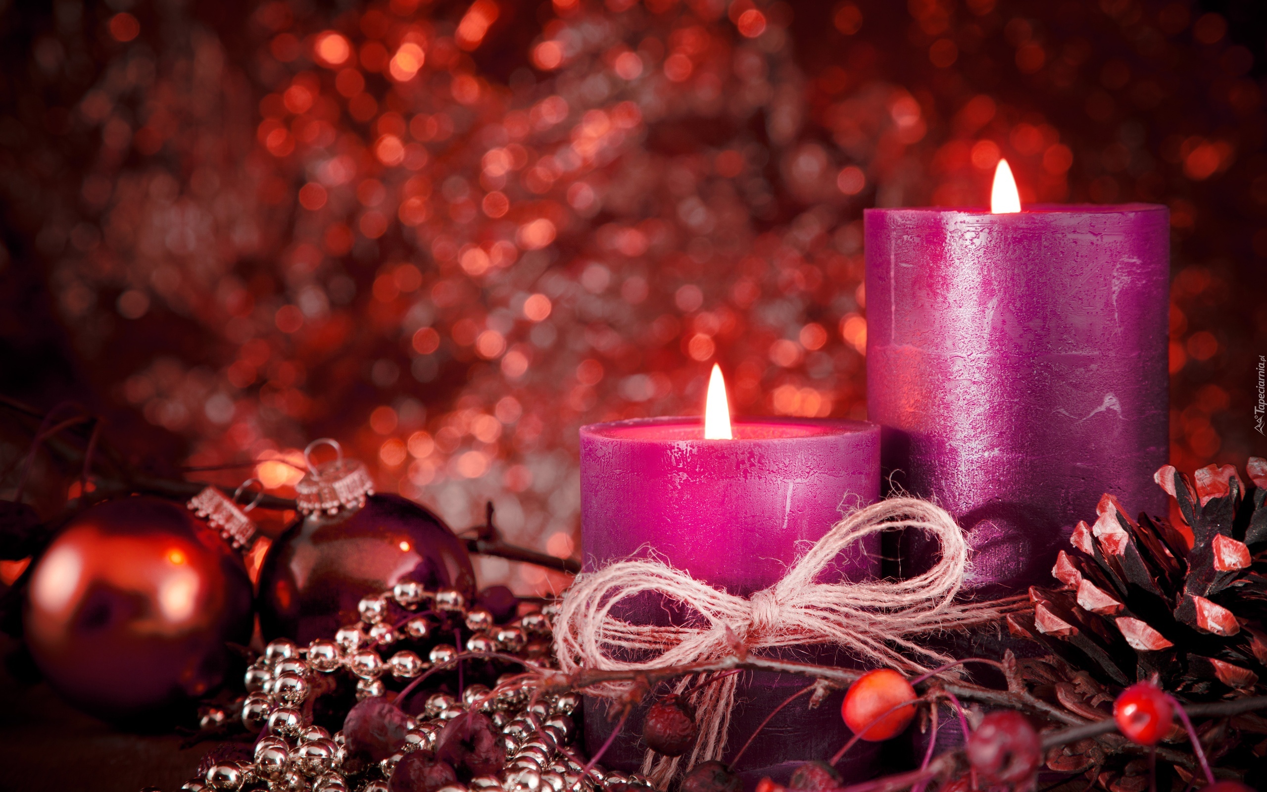 Edytor tapety: Bombki, Fioletowe, Świece, Dekoracja, Świąteczna
