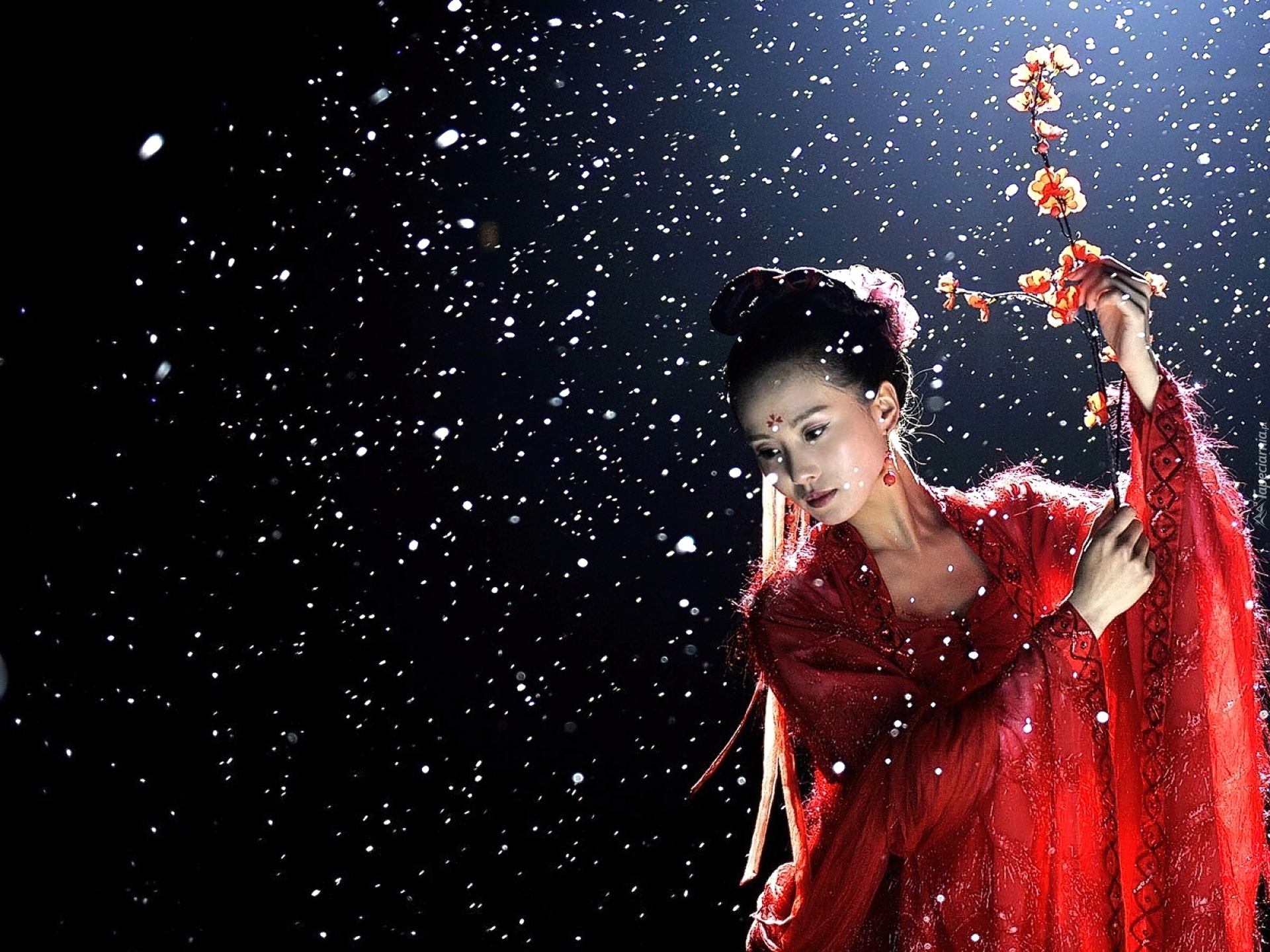 Edytor tapety: Brunetka, Gałązka, Kwiat, Czerwona, Sukienka