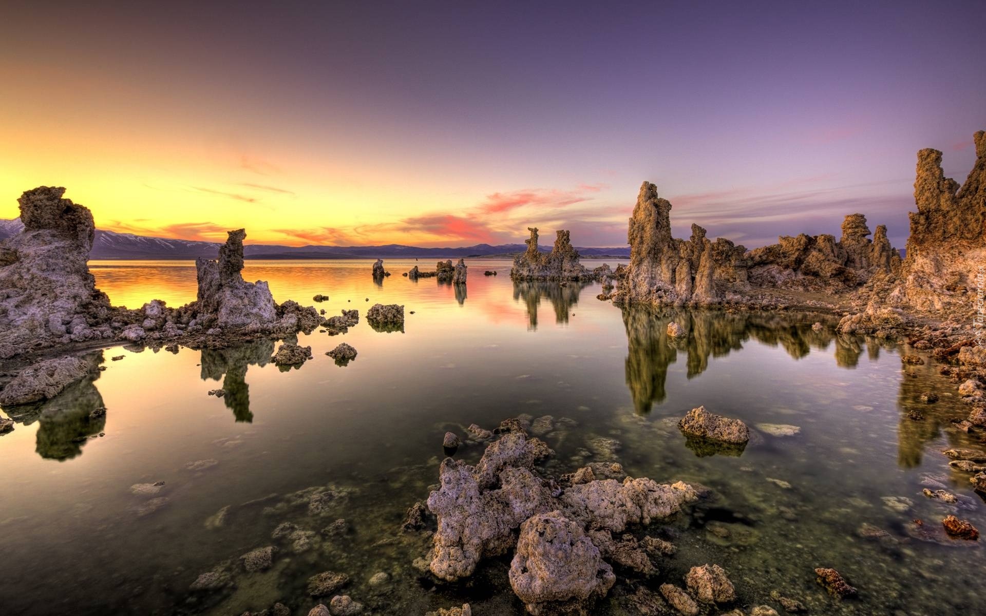 Edytor tapety: Jezioro, Skały, Zachód, Słońca