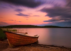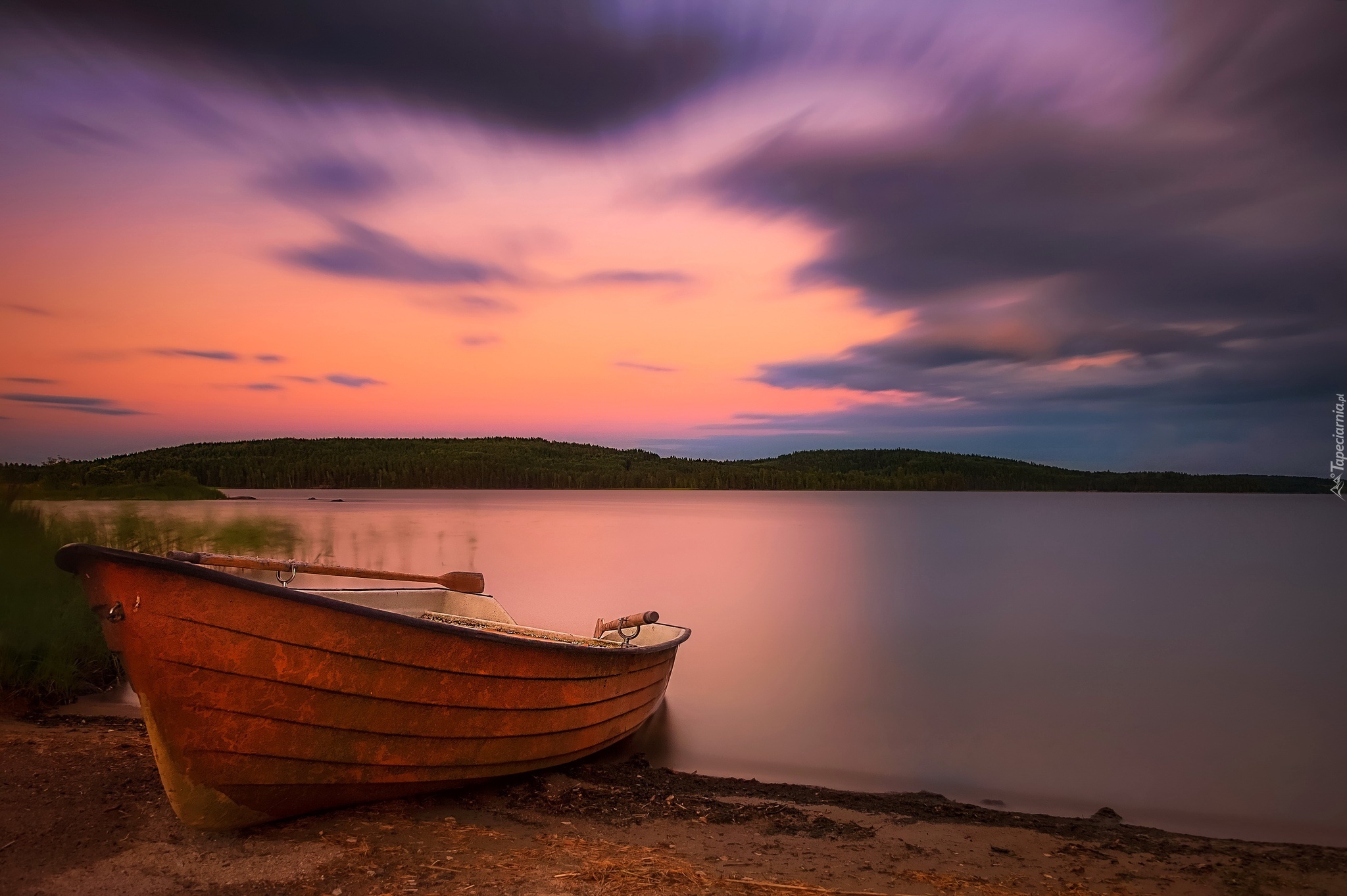 Edytor tapety: Jezioro, Zachód, Słońca, Brzeg, Łódź