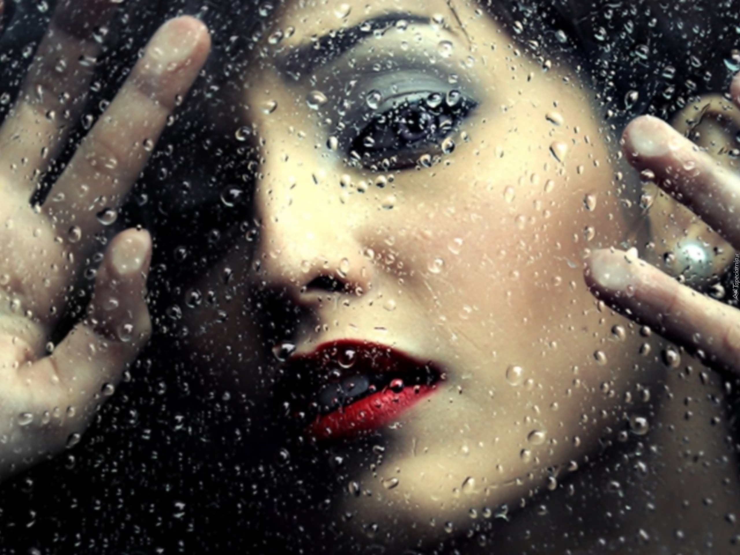 Edytor tapety: Smutna, Kobieta, Makijaż, Szyba, Deszcz