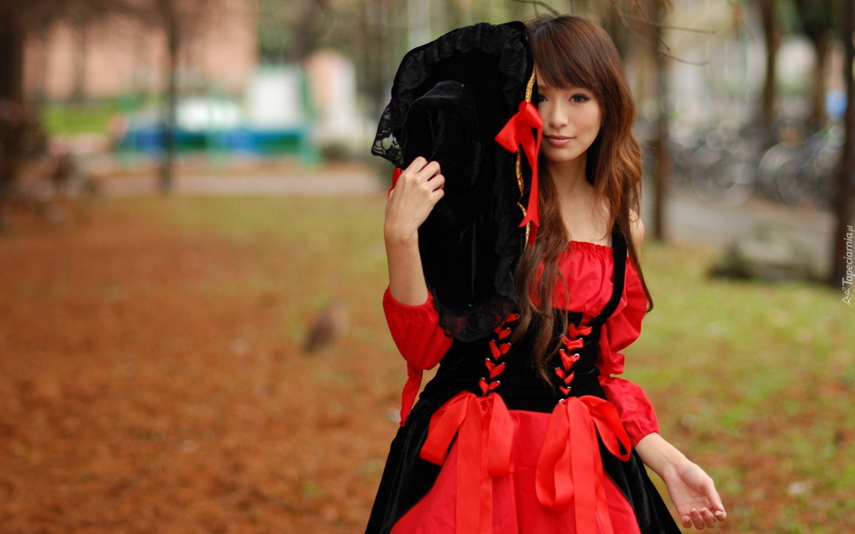 Edytor tapety: Dziewczyna, Czerwona, Sukienka, Park