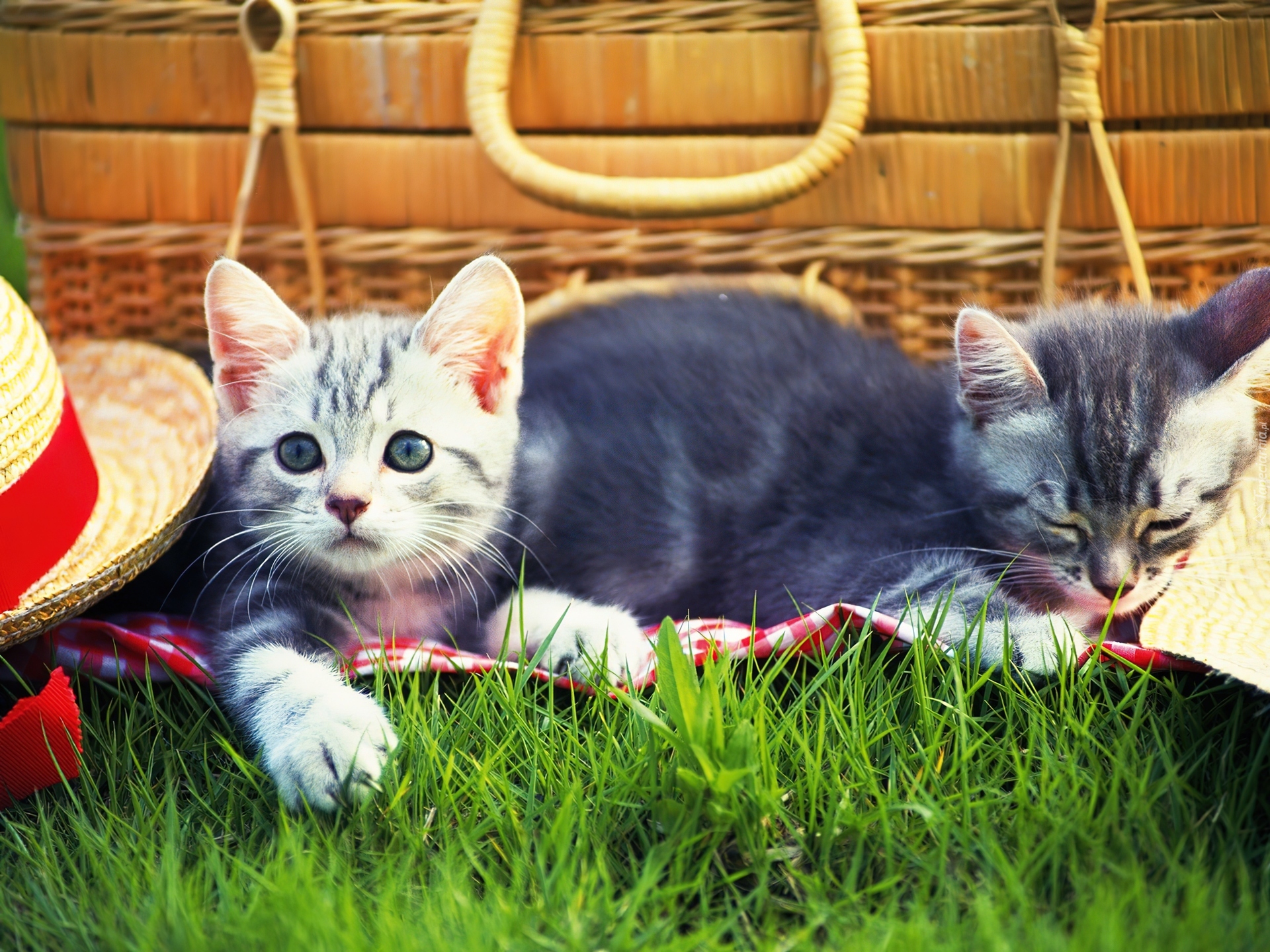 Edytor tapety: Koty, Kapelusz, Koszyk, Piknik, Trawa