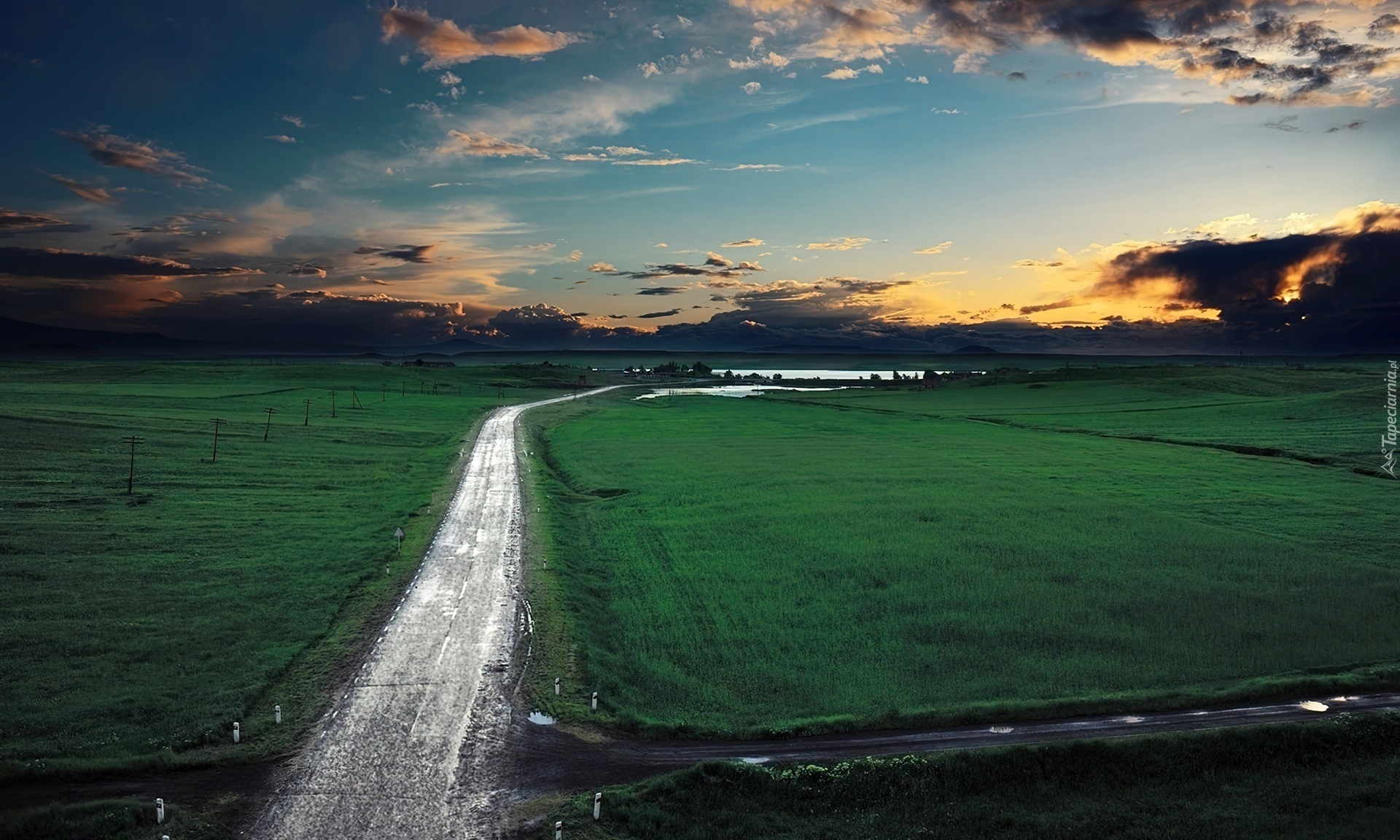 Edytor tapety: Droga, Polna, Łąki, Woda, Zachód Słońca