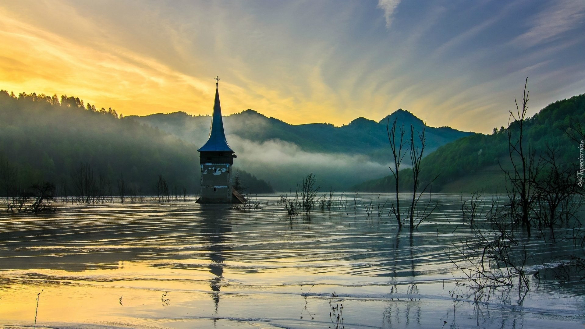 Edytor tapety: Kościół, Góry, Mgła, Świt, Powódź