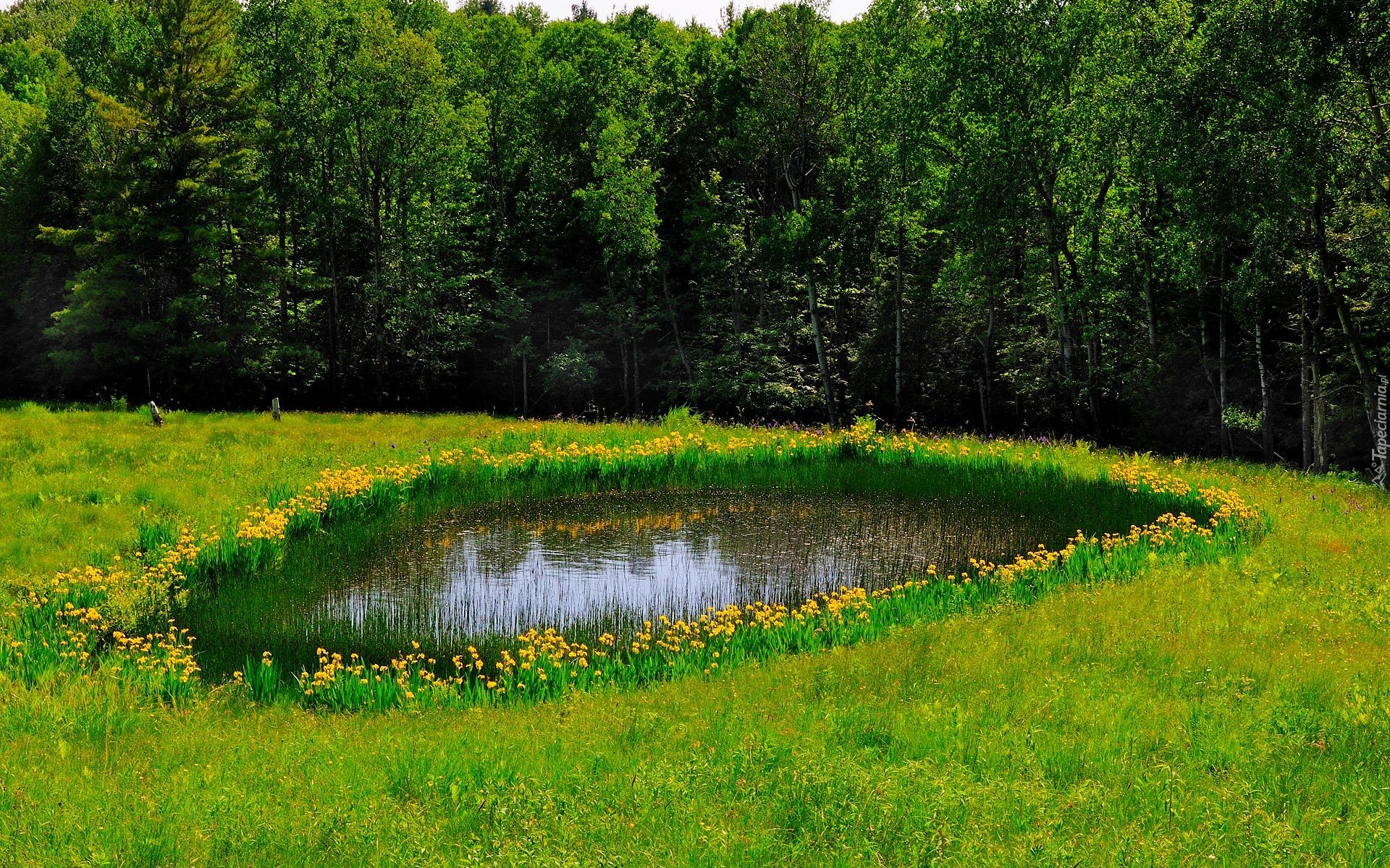 Edytor tapety: Łąka, Staw, Kwiaty, Trawa, Las, Odbicie