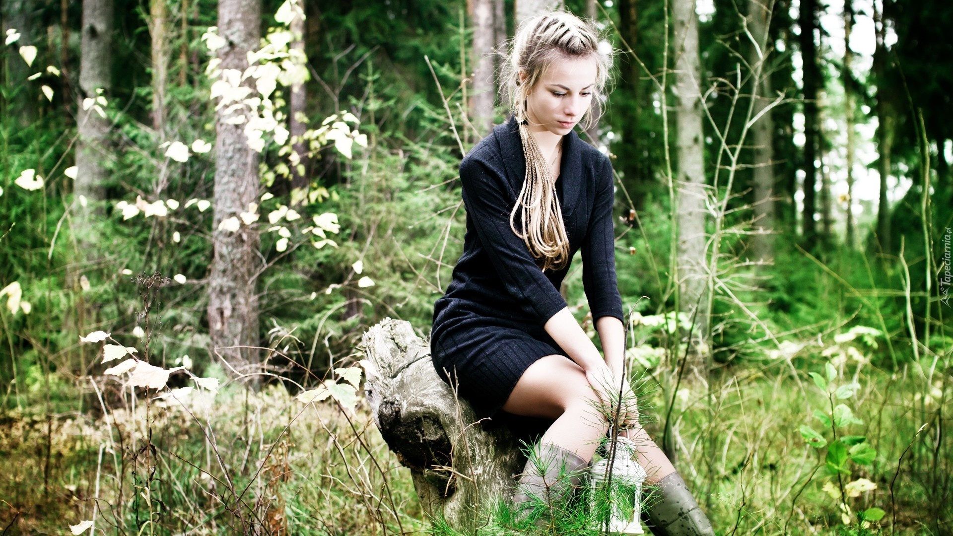 Edytor tapety: Dziewczyna, Czarna, Sukienka, Las, Latarenka