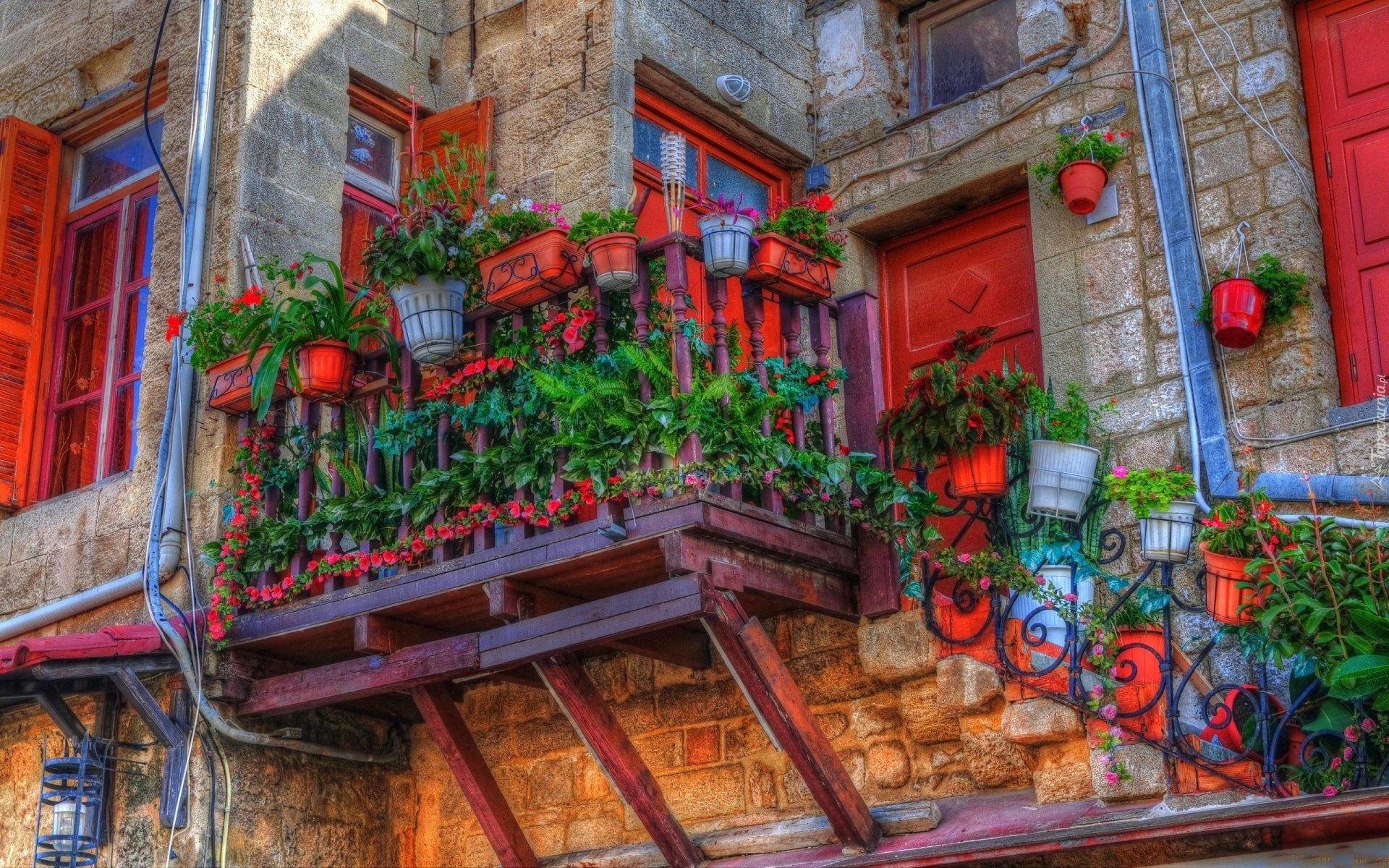 Edytor tapety: Schody, Balkon, Czerwone, Doniczki