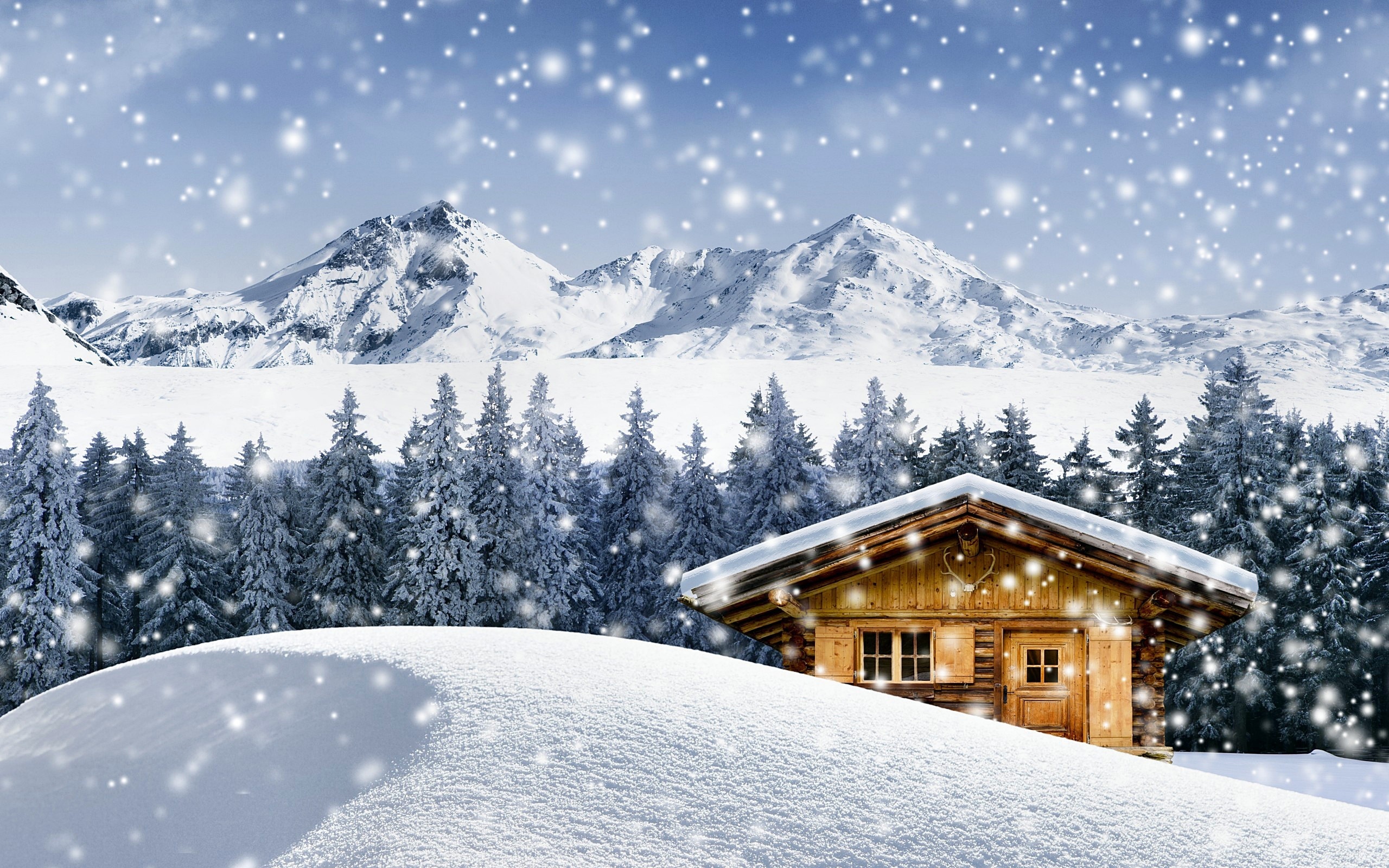 Edytor tapety: Drewniany, Domek, Zima, Góry, Las