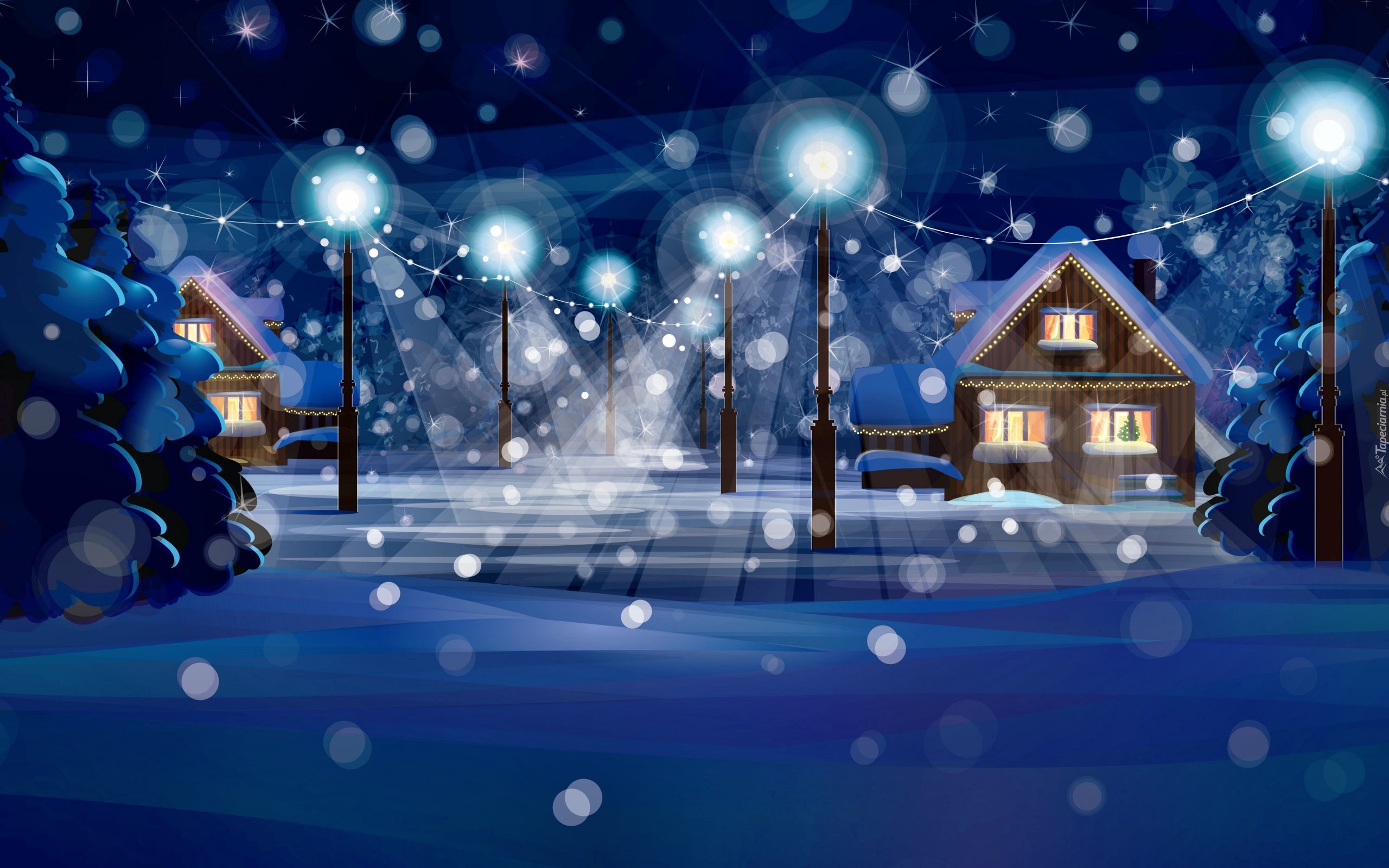 Edytor tapety: Oświetlone, Domy, Zima, Grafika