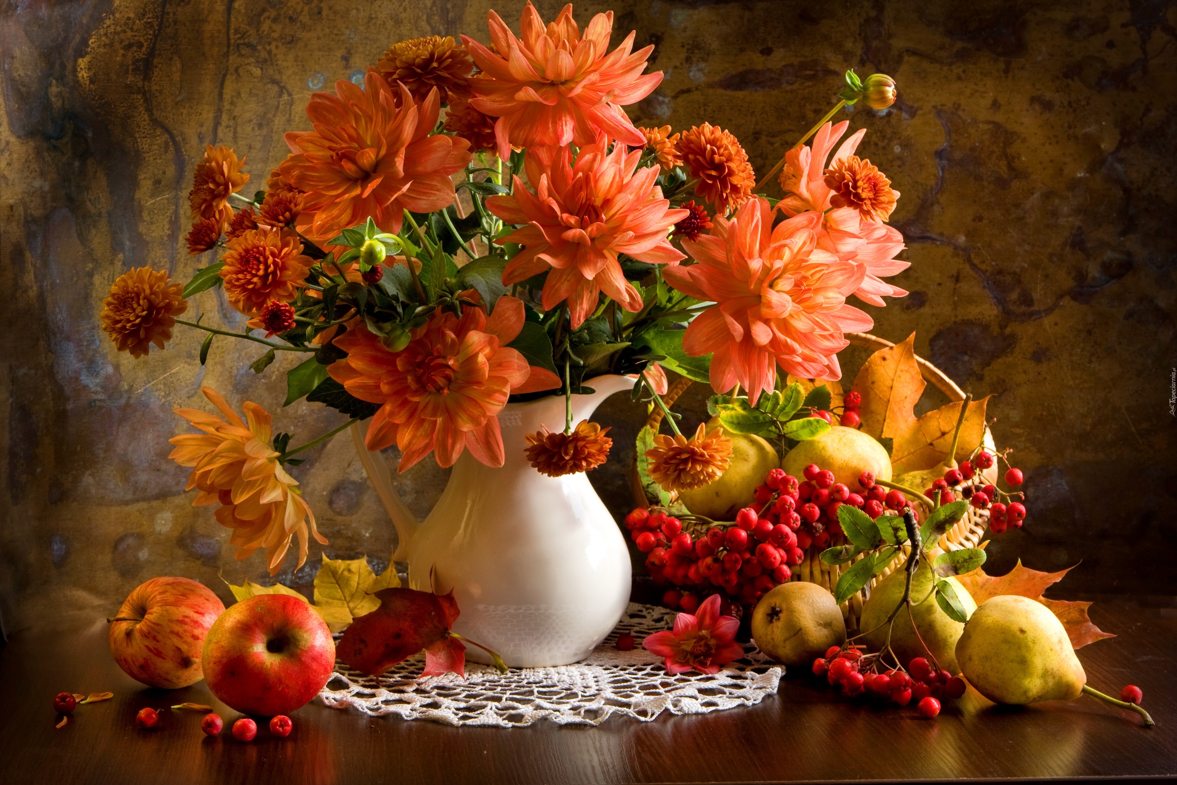 Edytor tapety: Wazon, Kwiaty, Dalie, Bukiet, Serweta, Jabłka, Gruszki