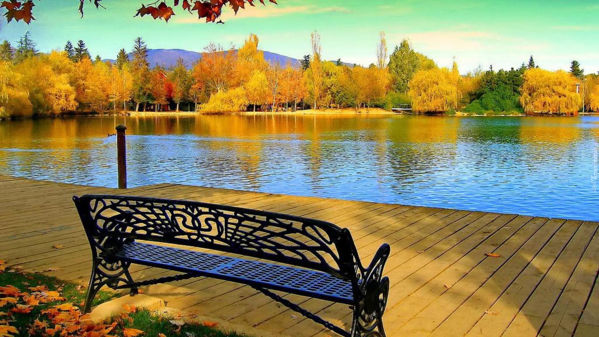Edytor tapety: Jesień, Jezioro, Drzewa, Ławeczka