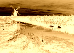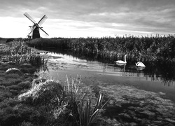Edytor tapety: Wiatrak, Rzeka, Łabędzie