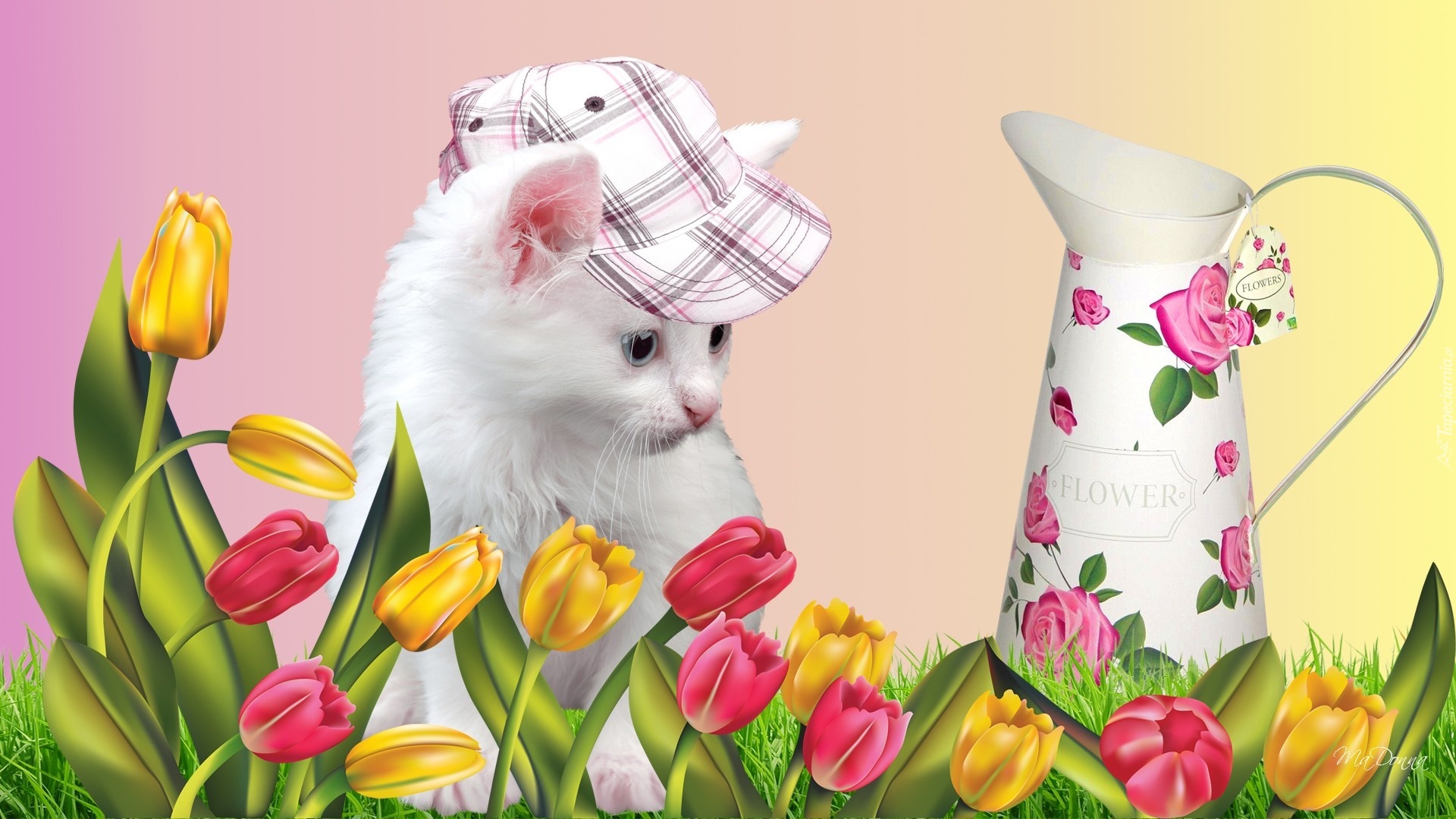 Edytor tapety: Biały, Kotek, Czapka, Tulipany