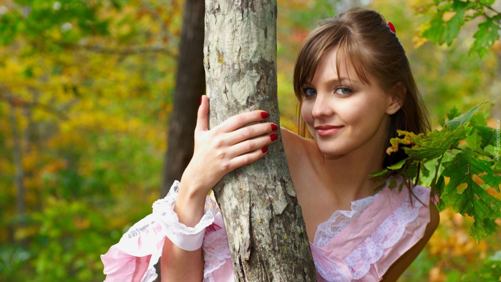 Edytor tapety: Kobieta, Makijaż, Uśmiech, Drzewo