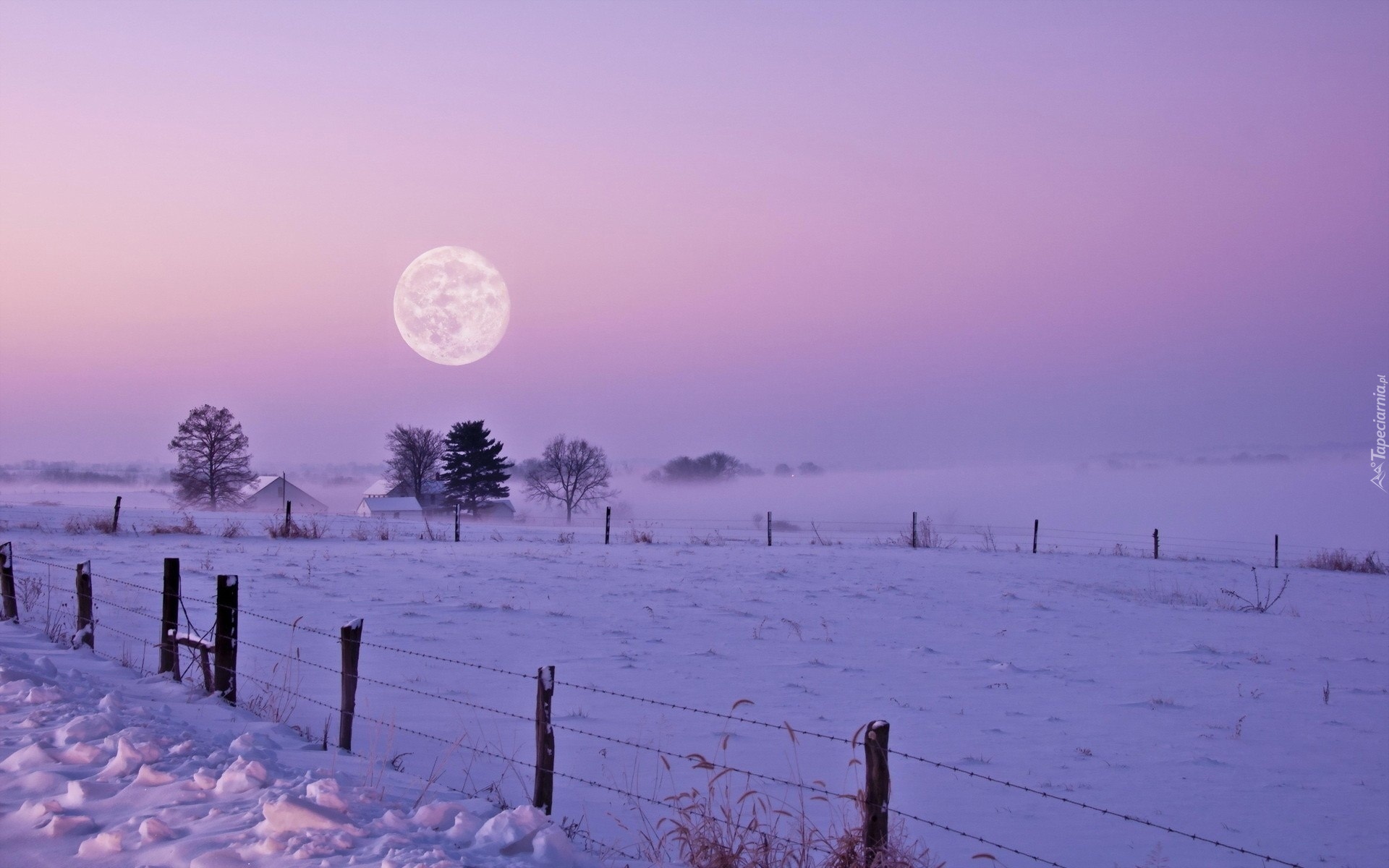 Edytor tapety: Zima, Zmierzch, Pola, Śnieg, Mgła, Księżyc