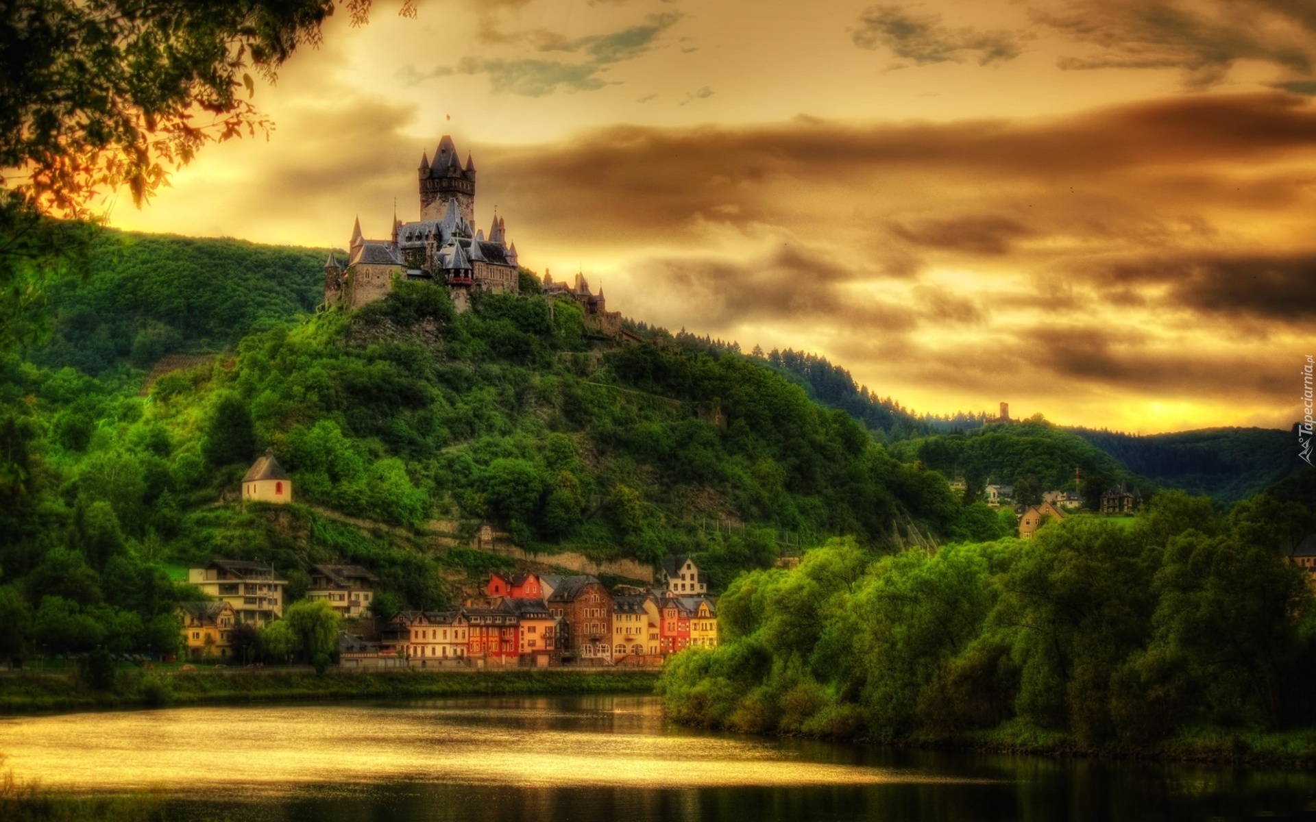 Edytor tapety: Zamek Reichsburg, Gmina Cochem, Rzeka Mozella, Niemcy, Wzgórze, Zachód słońca