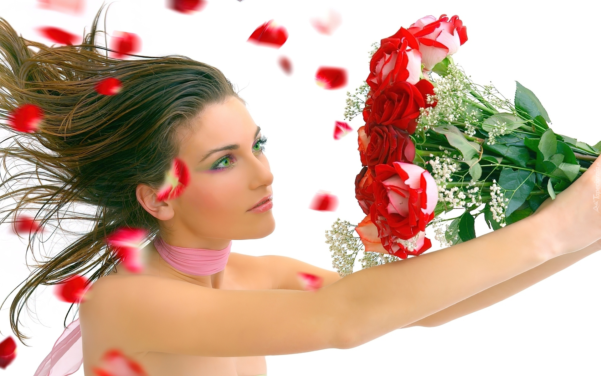 Edytor tapety: Kobieta, Bukiet, Czerwone, Róże, Płatki