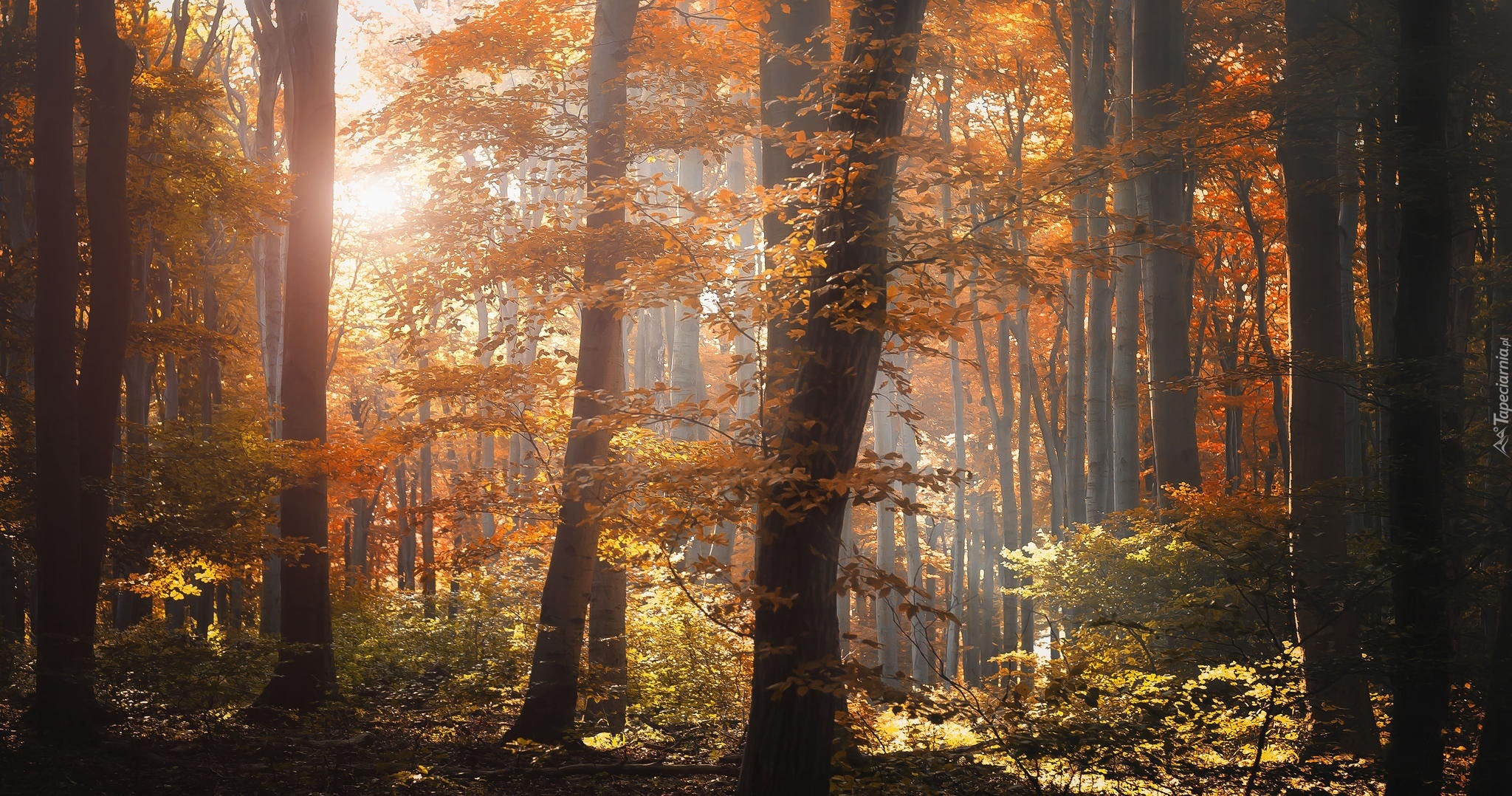 Edytor tapety: Las, Liście, Promienie słońca