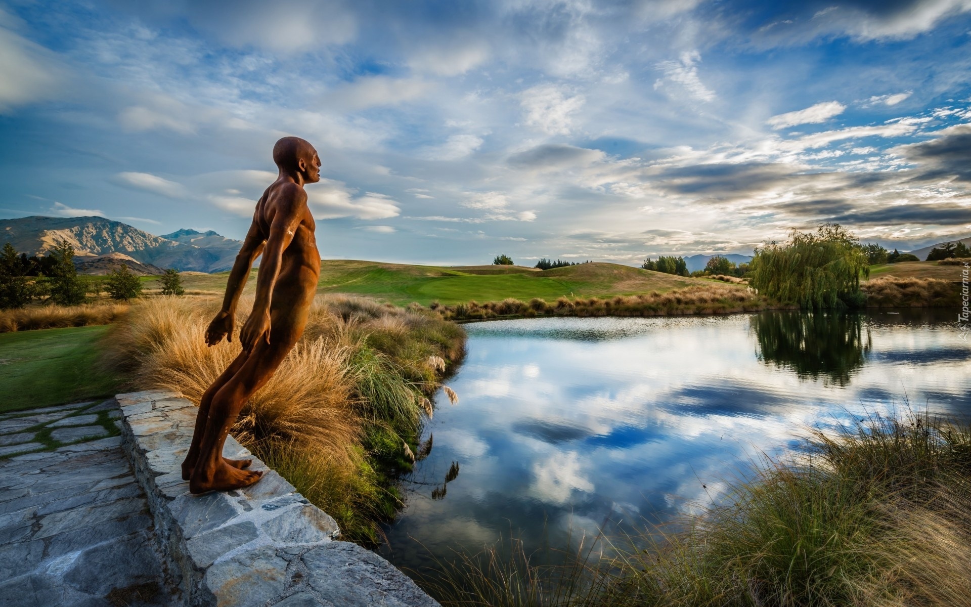 Edytor tapety: Góry, Jezioro, Trawy, Rzeźba, Człowiek