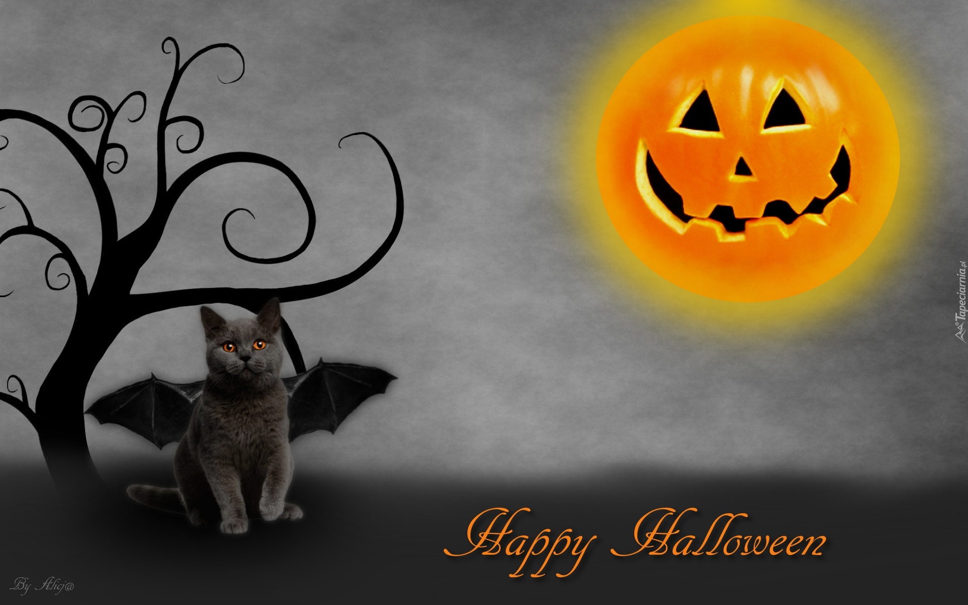 Edytor tapety: Halloween, Kot, Dynia, Drzewo